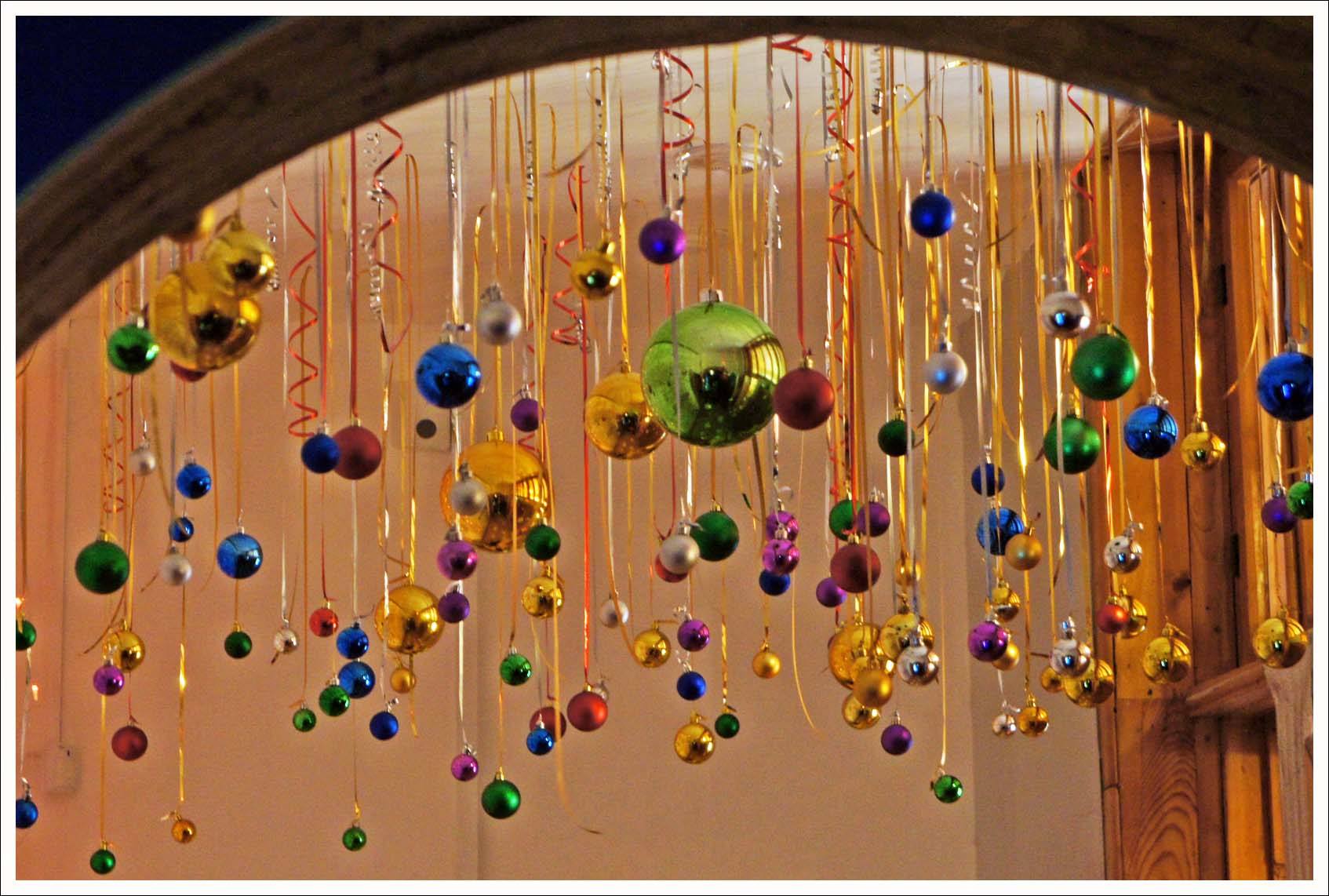 Una idea genial y simple es colgar bolas entre las columnas de las escaleras. Pueden alternar con tarjetas de felicitación para invitados. Si hay niños en la casa, en lugar de pelotas, puede colgar bolsas con dulces, frutas y juguetes en forma de símbolos del próximo año.