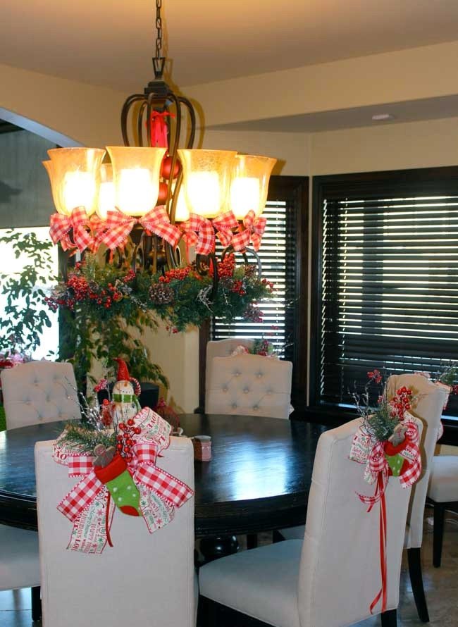 Una de las formas más fáciles y rápidas de enmarcar sillas en un atuendo festivo es atar uno o más lazos. Para la decoración, puede usar hermosas piezas de tela, materiales de malla de pvc. Conos de abeto, cuentas grandes, broche, bolas y otros elementos complementarán la composición. El color del vendaje navideño es mejor para elegir oro, escarlata, azul o verde oscuro. Además, las fundas textiles se ven originales en los respaldos y patas de las sillas.