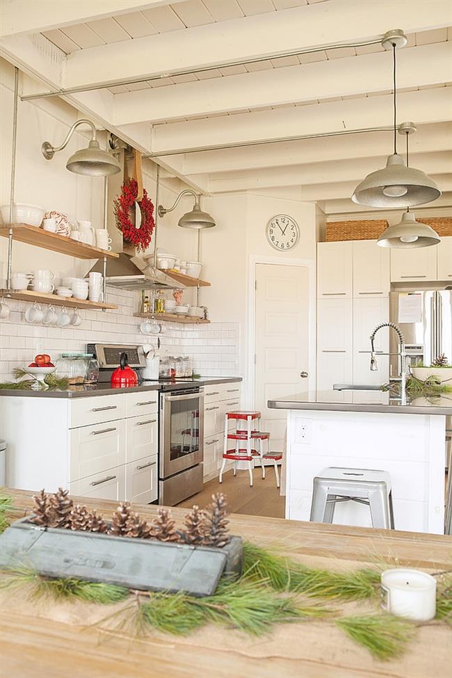 La decoración navideña principal de cualquier habitación es un árbol. Pero no en todas las cocinas encajará, y aún más, encajará en el interior. Reemplace la belleza invernal con una corona de coníferas natural. Tal elemento de decoración se verá genial en una pared, ventana o puerta. Los juguetes de vidrio y las guirnaldas de colores brillantes harán las delicias de la familia en la víspera de las vacaciones.