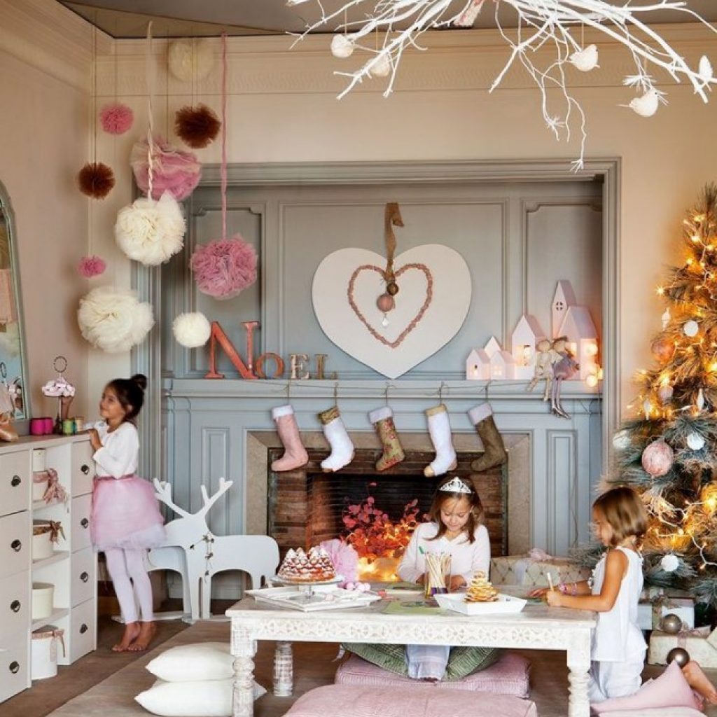 El área más extensa para la creatividad son las paredes. Todo es adecuado para su diseño. Se pueden pintar con un niño, aplicar con una plantilla, usar decoraciones, inscripciones, pelotas, peluches, manualidades temáticas. Con un techo de oportunidades menos, pero lo son. Aquí, las guirnaldas, colgantes, pompones, copos de nieve de papel se verán originales.