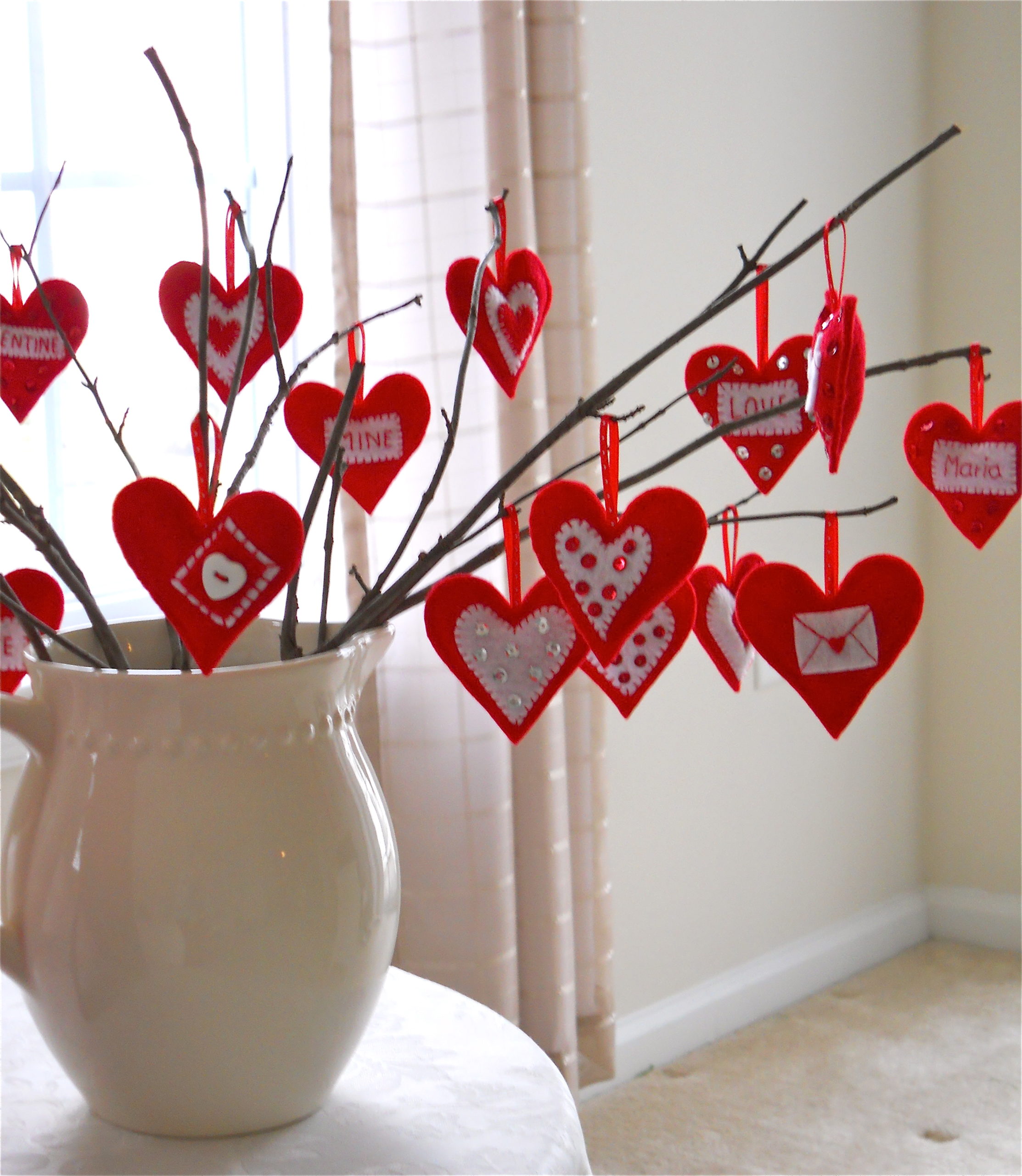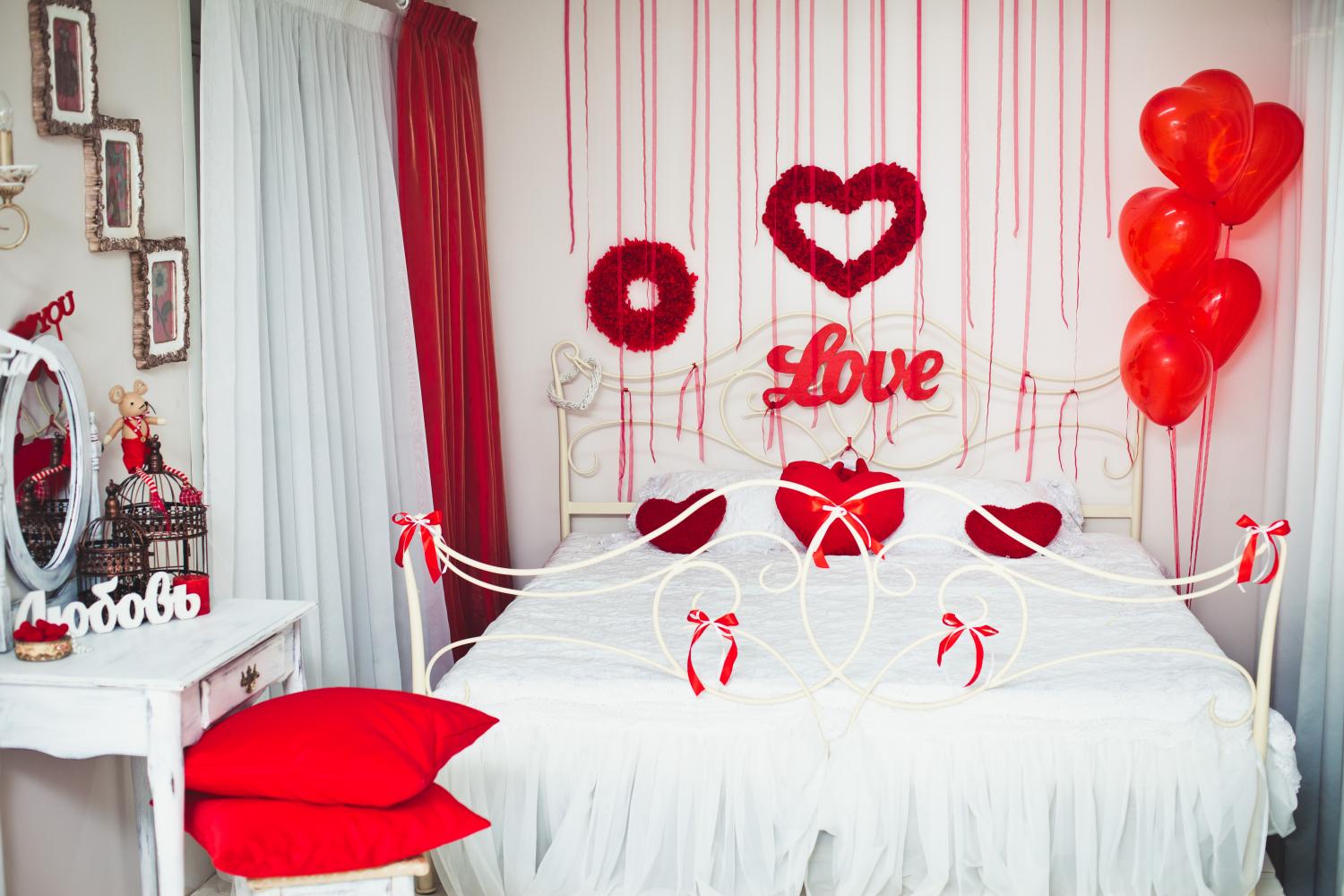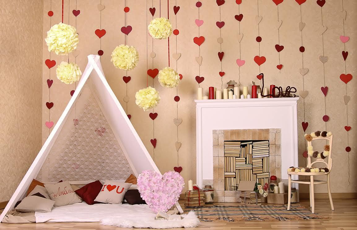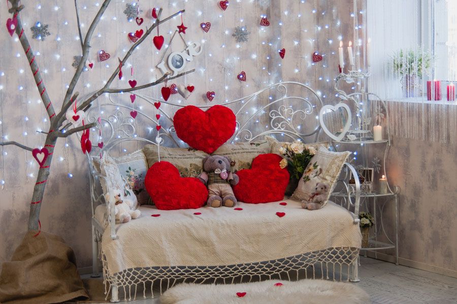 Estas vacaciones no se pueden imaginar sin la atmósfera sincera y las cálidas confesiones. Para crear el interior apropiado, hay muchas opciones. El calor de las pequeñas velas colocadas en toda la habitación dará una sensación de armonía. Las velas transparentes se pueden envolver con papel de colores con destellos, dejando una ventana en forma de corazón.