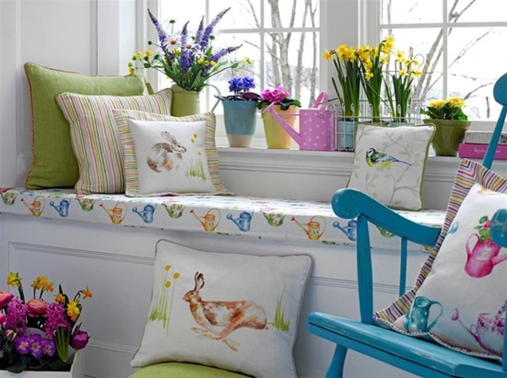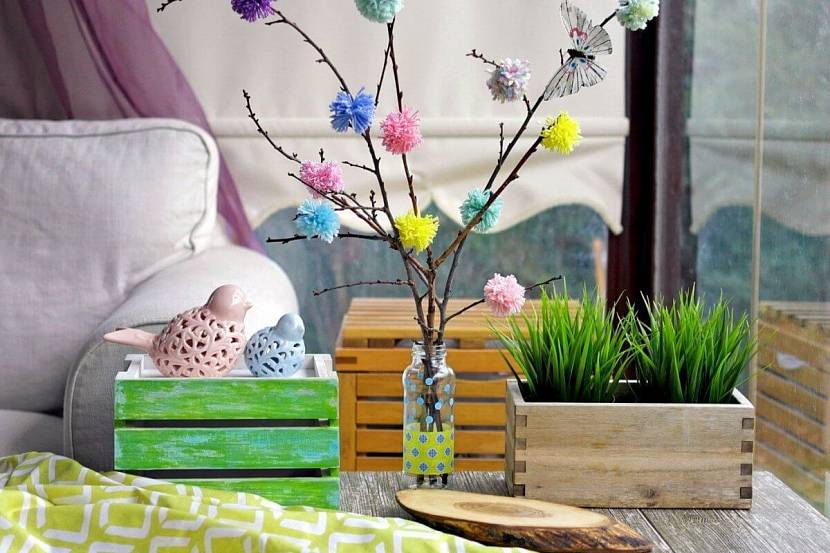 Si no planea cambiar fundamentalmente el interior, puede detenerse agregando notas de primavera con la ayuda de elementos decorativos simples. El método más asequible para decorar el espacio es el uso de ramos de flores. Pueden ser plantas vivas en macetas, composiciones de ramas con flores y artesanías hechas de cuentas, telas y papel de colores.