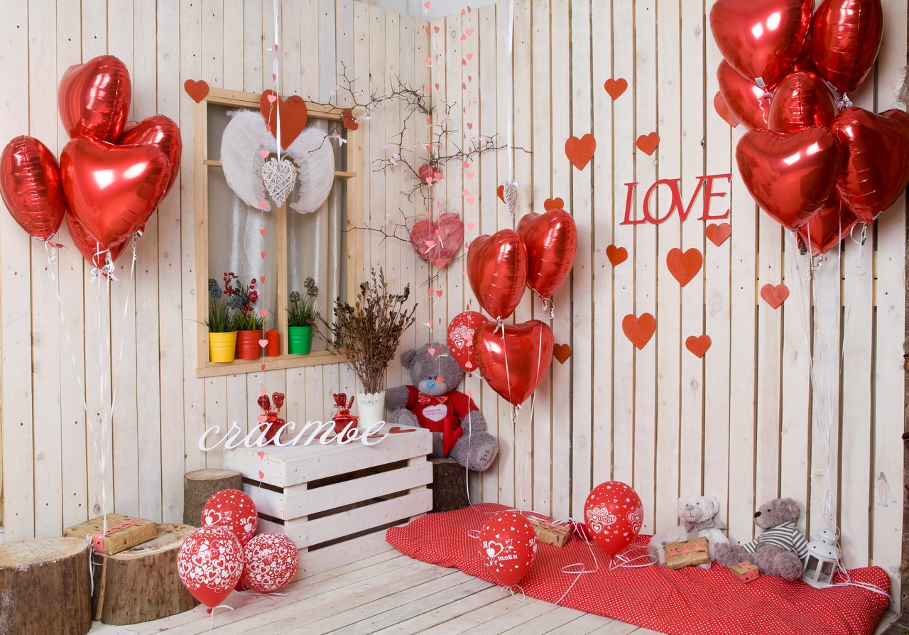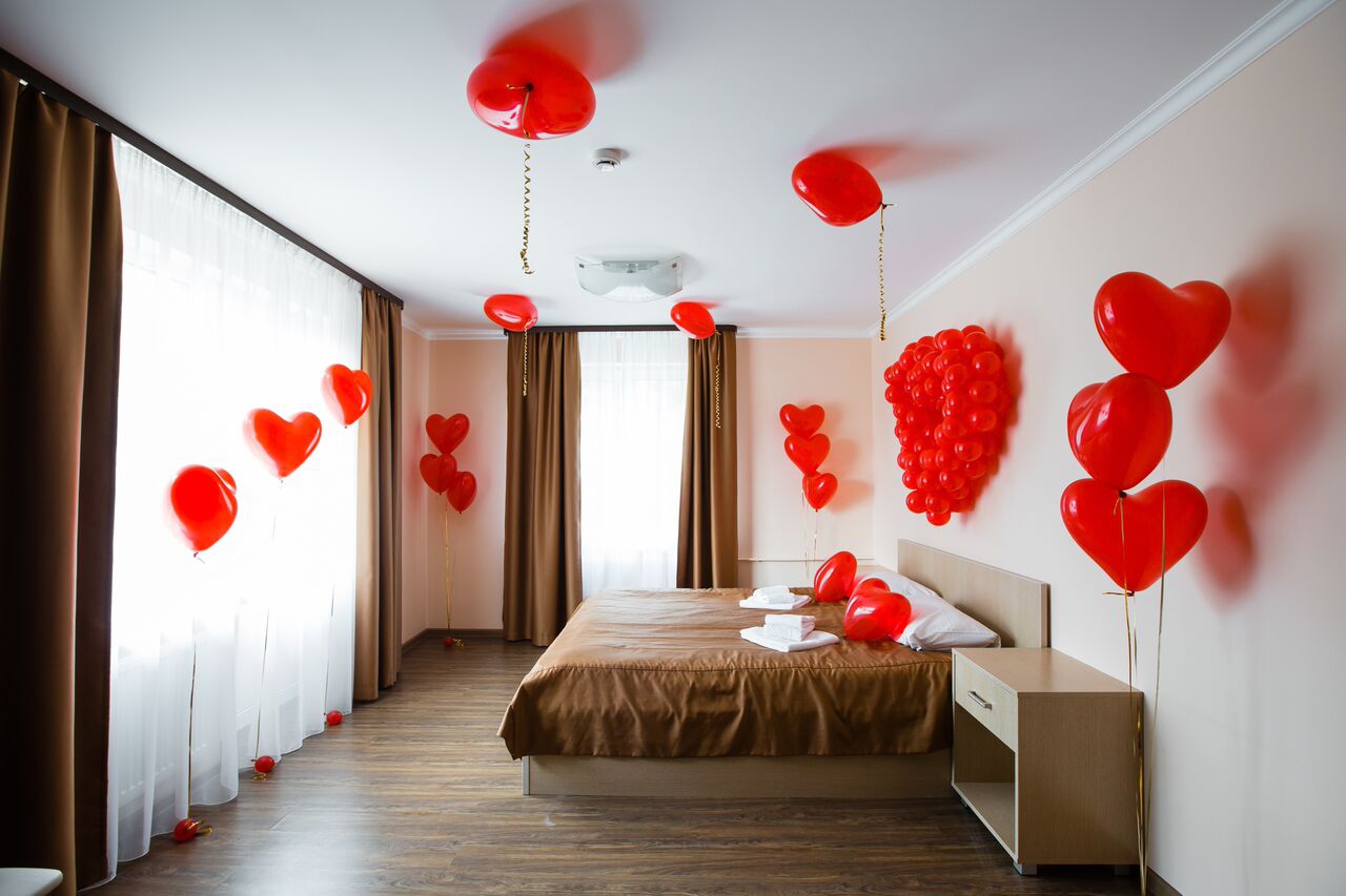 La decoración de la gran sala para el día de San Valentín o para una boda serán fotos de una pareja de enamorados. Una foto que representa momentos conmovedores se puede arreglar en forma de guirnalda, bellamente decorada o hacer un hermoso mural en la pared. La sala estará decorada con coronas originales hechas de tela roja, madejas de serpentina, oropel, cualquier material natural.