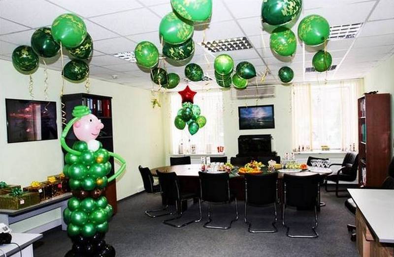 Se puede colgar una guirnalda en forma de banderas con felicitaciones a lo largo de una de las paredes. Single se verá bien en las montañas rusas. Para complementar la composición ayudará a los dibujos infantiles de temas relevantes. Con la ayuda de hilo, hilos, bloques para notas en la pared, puede diseñar el número 23 y escribir una felicitación.