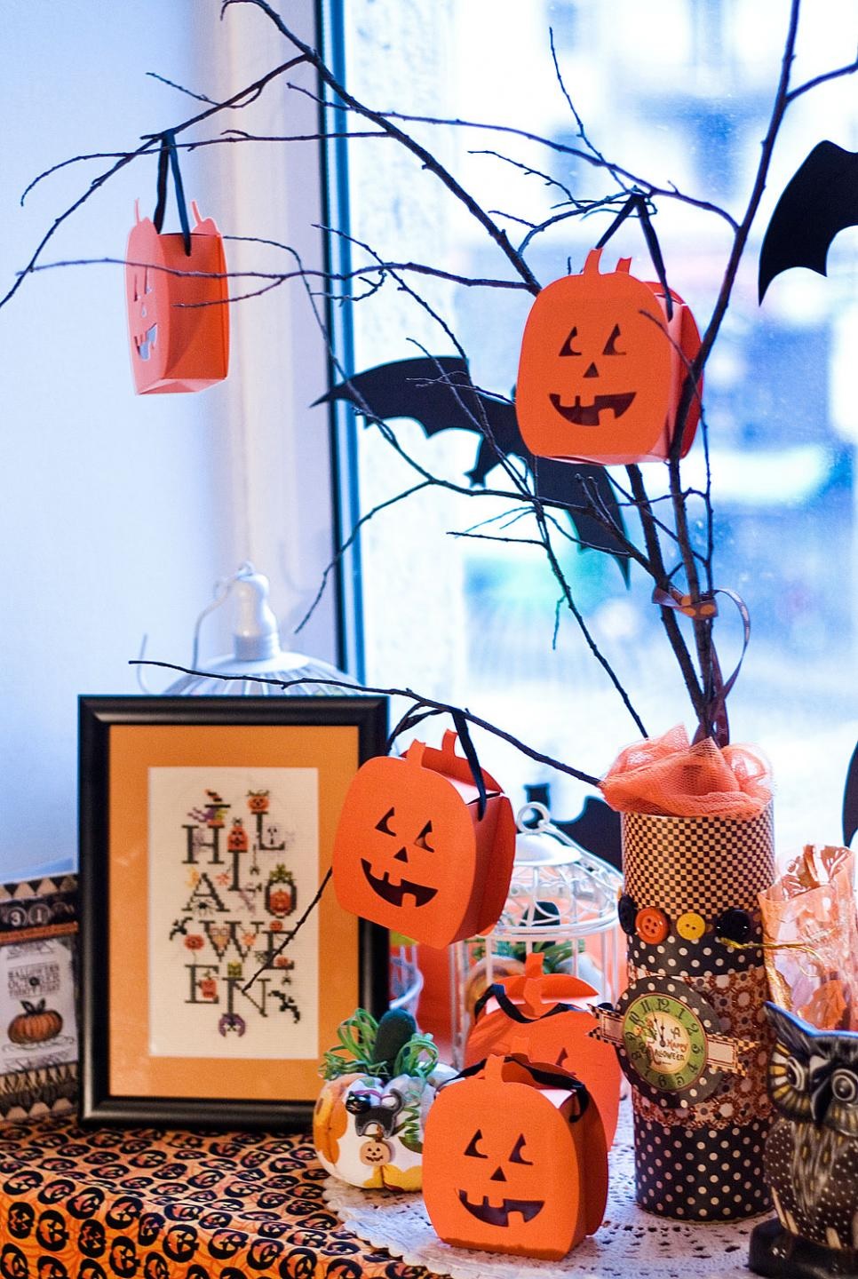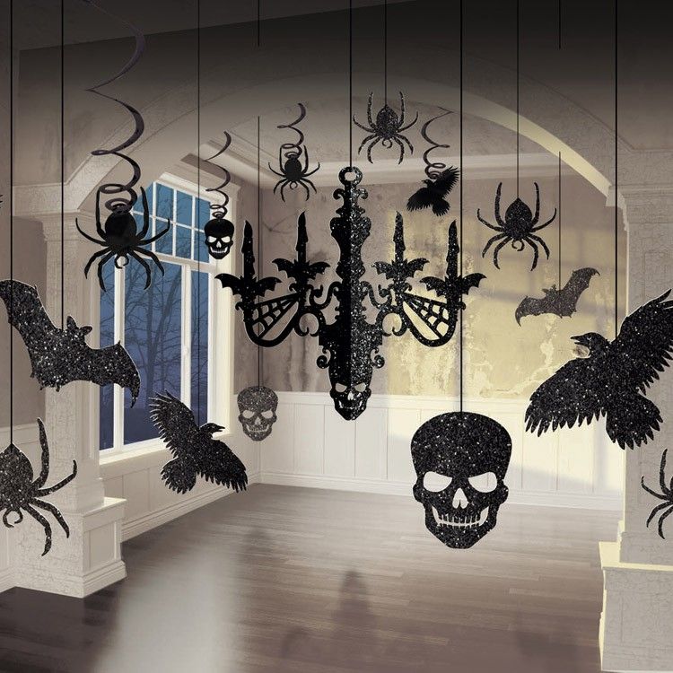 Los accesorios y la decoración de Halloween son de naturaleza específica, por lo que no habrá problemas para encontrar materiales adecuados. Una guirnalda con fantasmas enfatizará la característica especial de las vacaciones. Las siluetas deben estar formadas por pequeñas aletas blancas y atadas a un hilo.