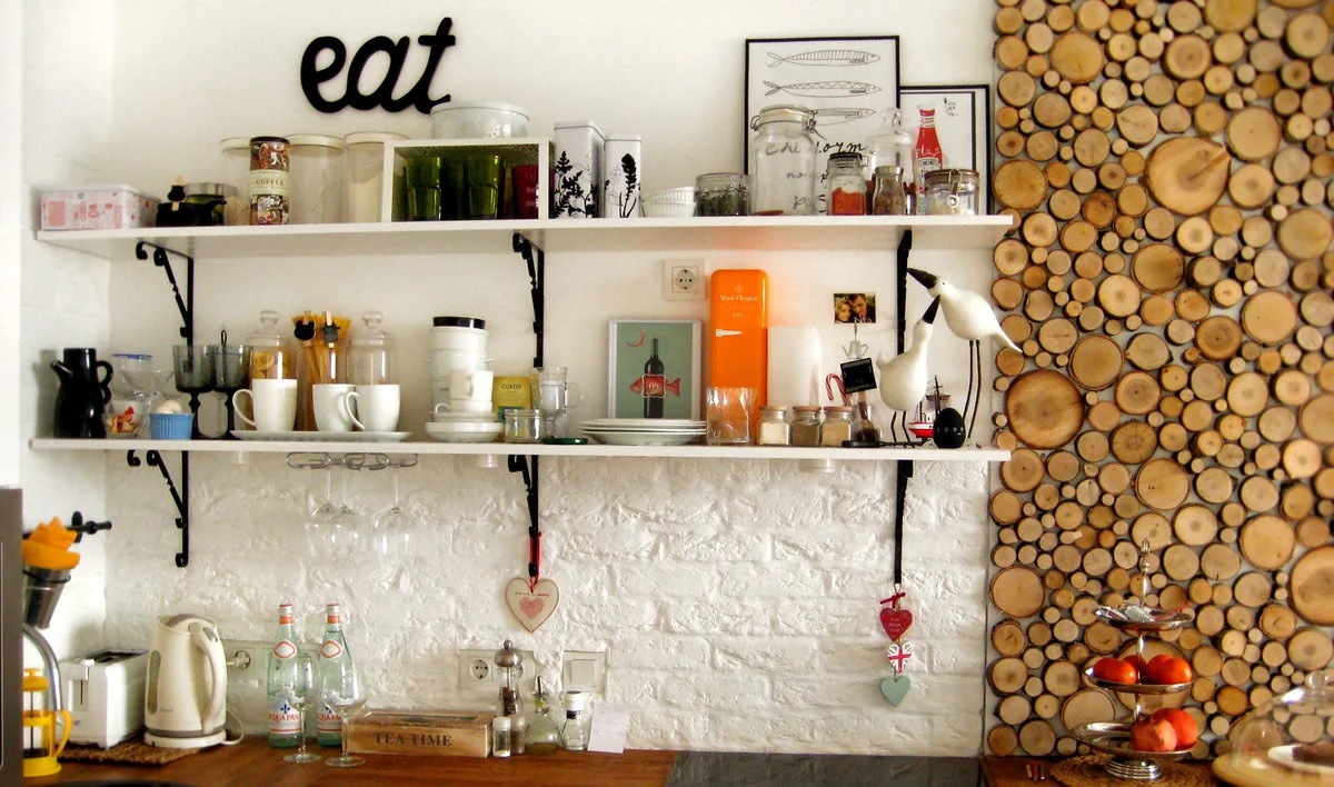 Estantes abiertos con tarros de especias, colecciones de café y té.