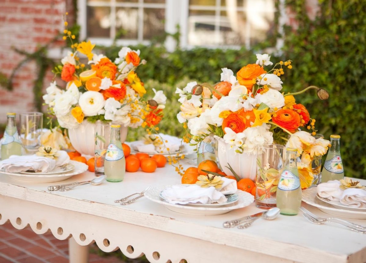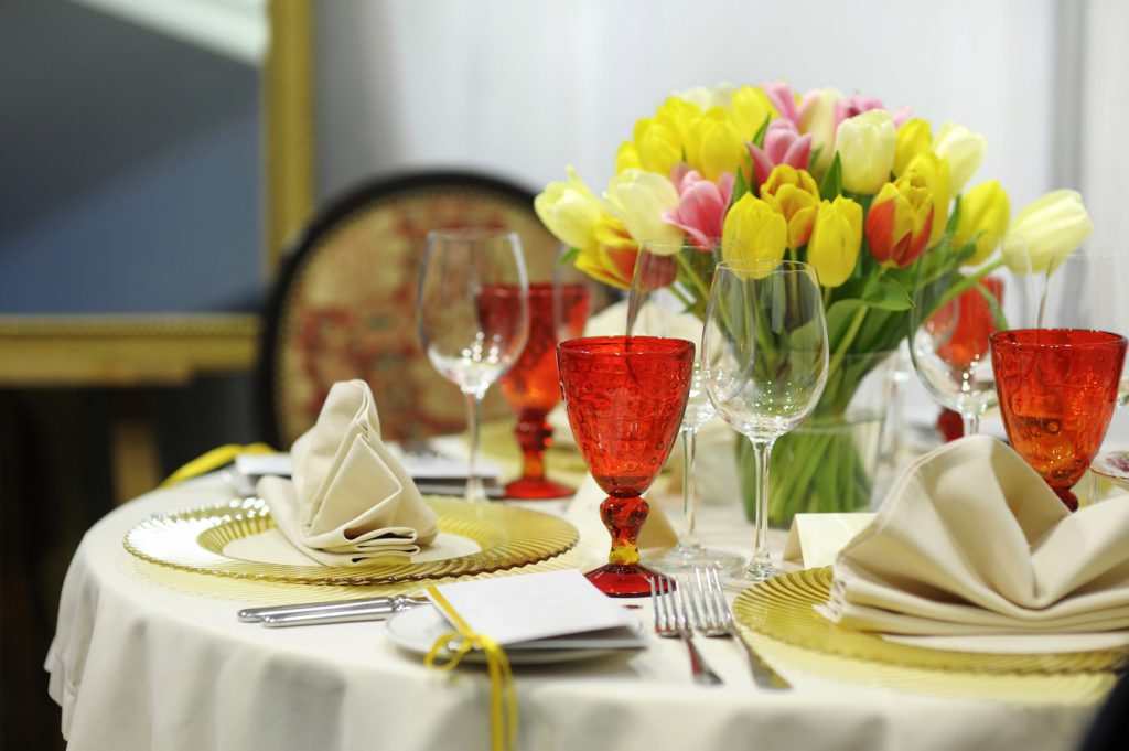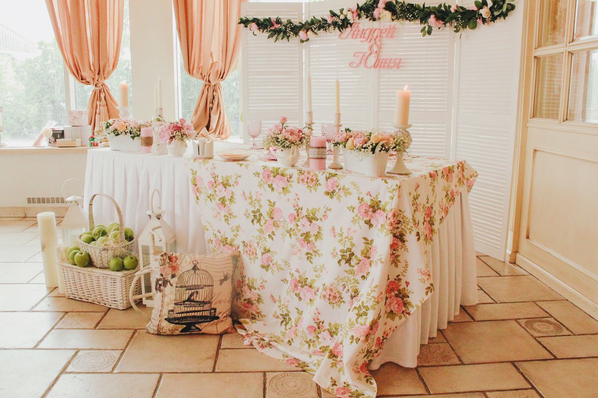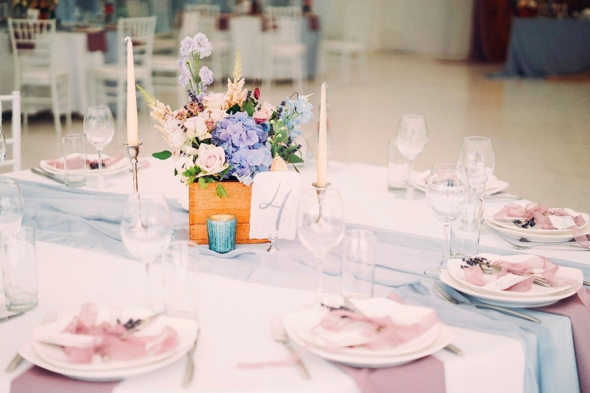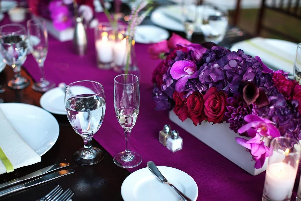 Se debe hacer una variedad de composiciones de flores para la mesa en un evento con el mismo estilo y combinación de colores que las otras decoraciones florales. Por ejemplo, en una celebración de bodas, tienen algo en común con guirnaldas en las paredes, autos, flores en floreros e incluso con un ramo de la novia.