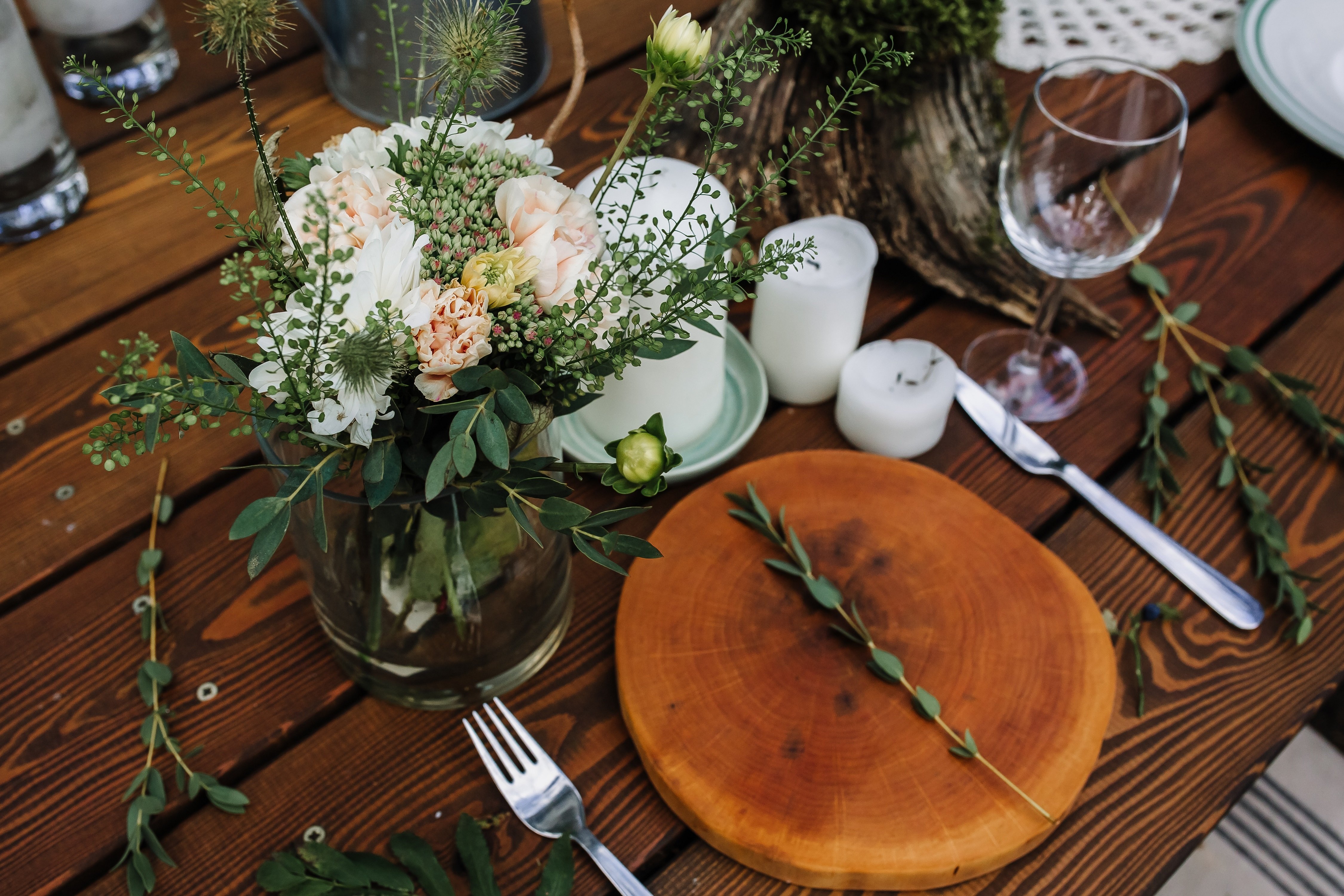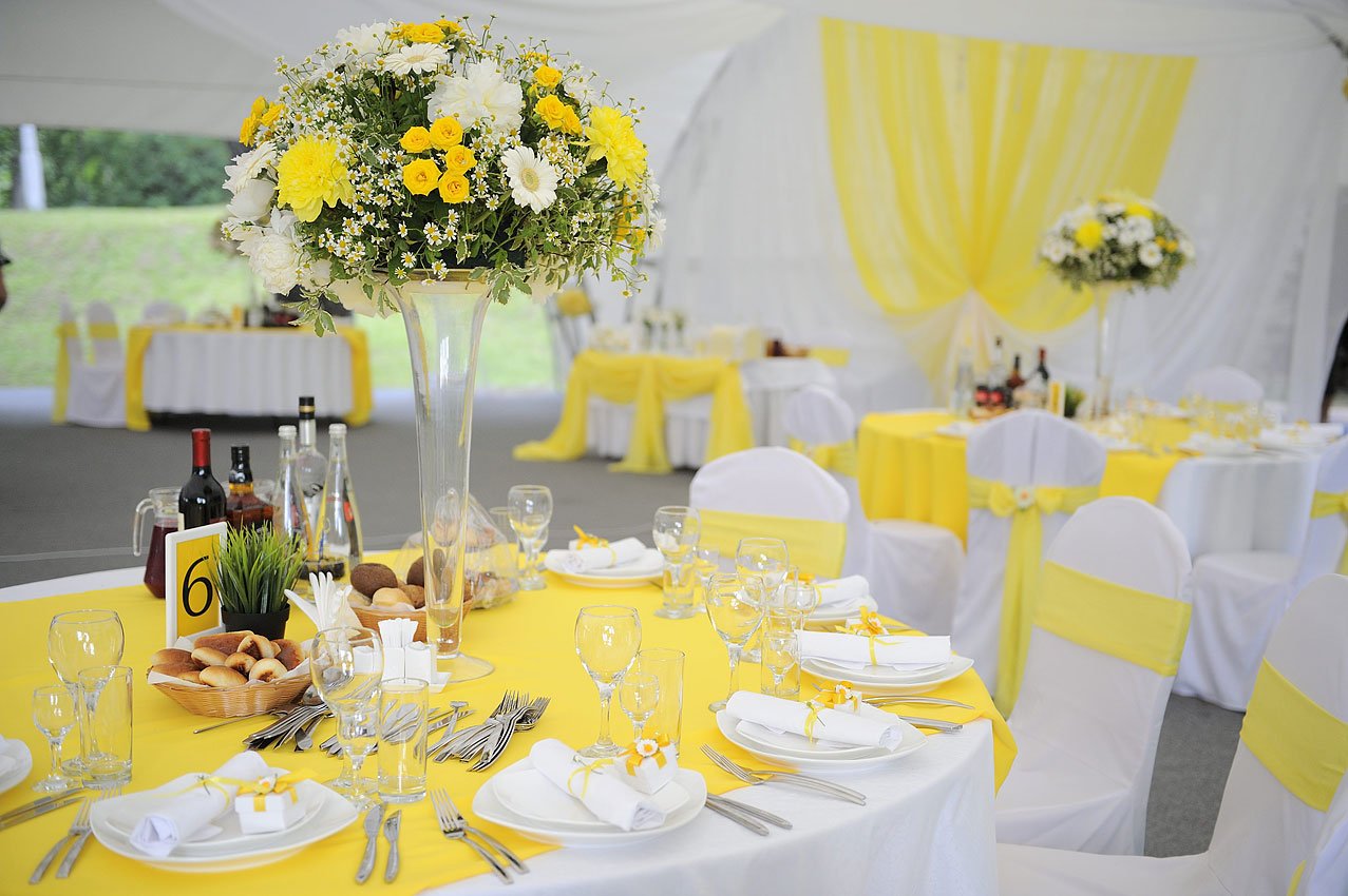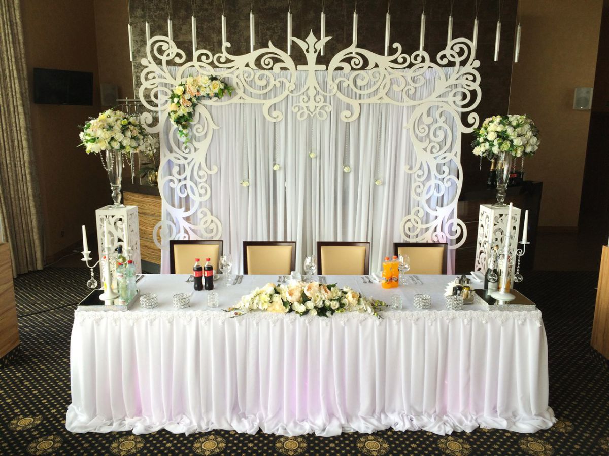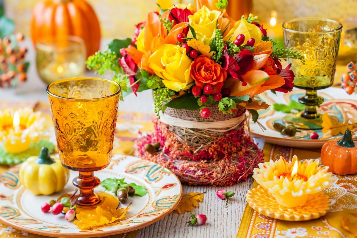 Se debe hacer una variedad de composiciones de flores para la mesa en un evento con el mismo estilo y combinación de colores que las otras decoraciones florales. Por ejemplo, en una celebración de bodas, tienen algo en común con guirnaldas en las paredes, autos, flores en floreros e incluso con un ramo de la novia.