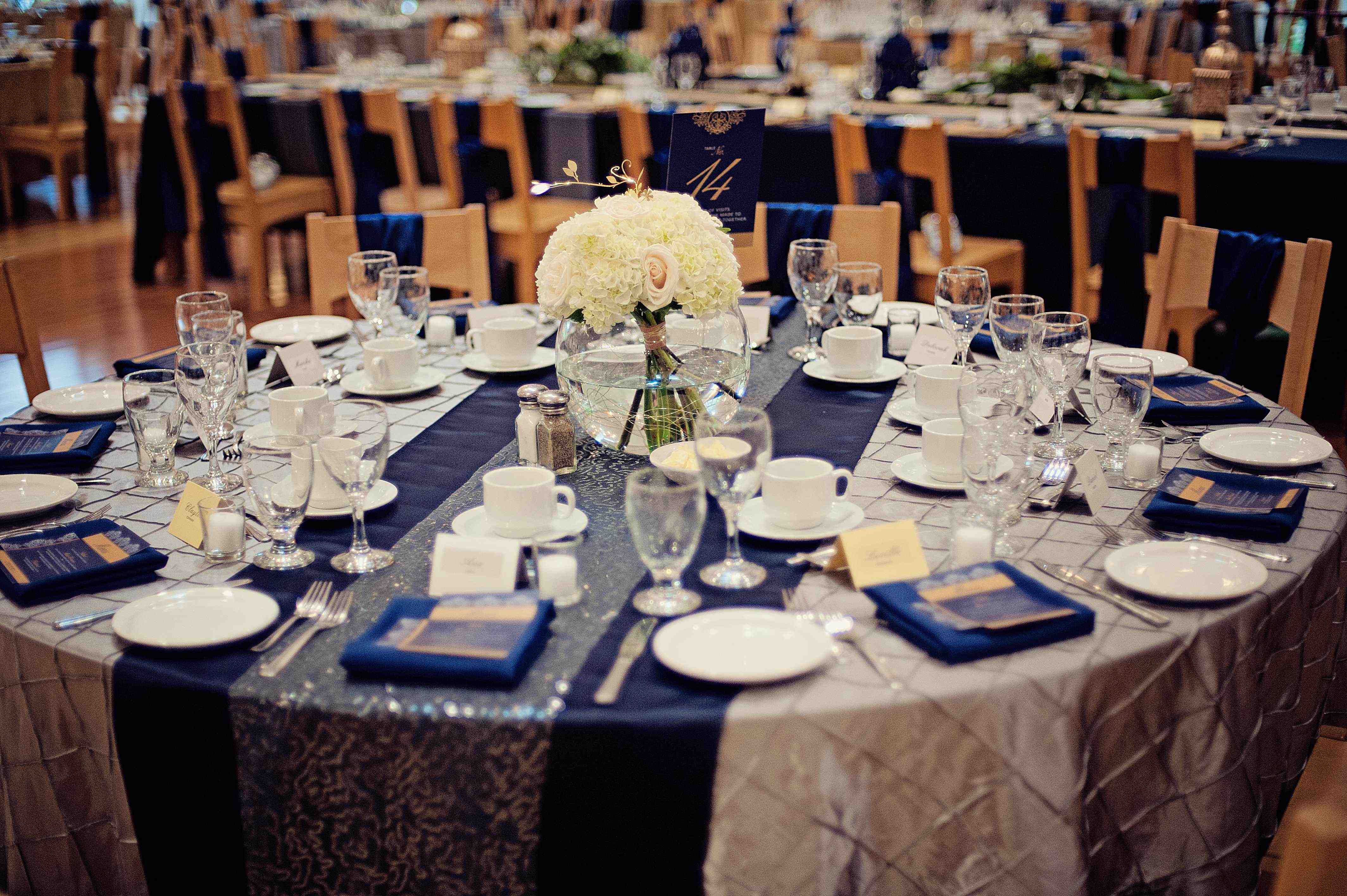 La elección de los colores depende de su gusto y la naturaleza del evento. Lo principal es que todos los elementos deben combinarse entre sí, enfatizando el brillo y enfatizando la blancura de cada uno de ellos. Combinaciones de colores de aspecto ideal de colores relacionados. Por ejemplo, el azul cielo admitirá perfectamente el turquesa y el azul oscuro. En cualquier mesa, los detalles en oro, plata, cristal y perlas son apropiados.