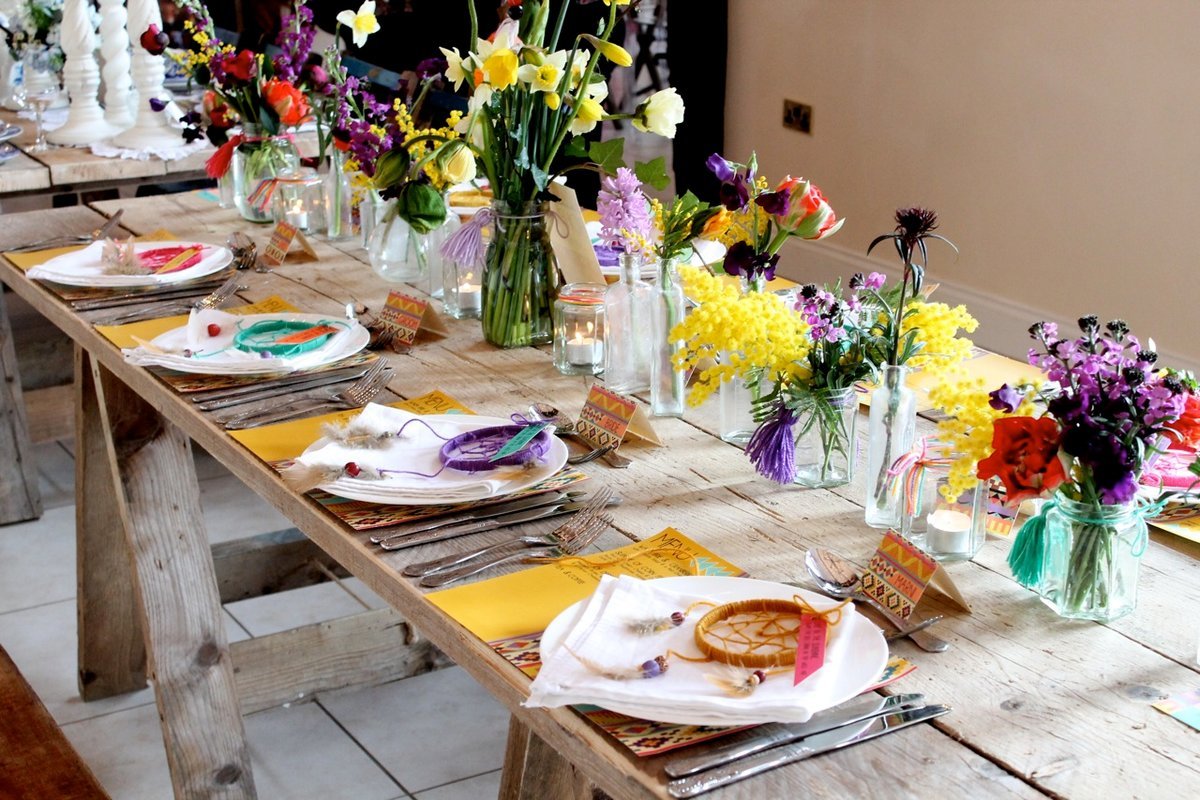Cumpleaños mexicano: implica una gran cantidad de colores, la ausencia total de un mantel, el uso de platos lisos brillantes o decorados con adornos nacionales multicolores, posavasos de mimbre para platos, textiles con rayas contrastantes y composiciones de flores y cactus en las mesas. Como decoración, puede usar mini-maracas, un instrumento nacional español. Los platos se pueden decorar con pimientos picantes. Las gafas deben estar equipadas con tubos de cóctel.