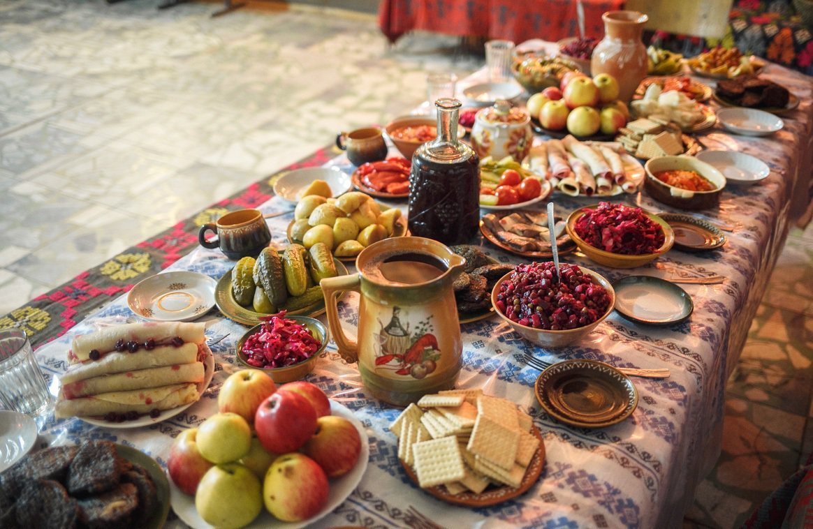 La manera rusa: los aperitivos se colocan en la mesa de antemano en platos en porciones: vasos o tazas, o en una ensaladera común. La mesa se sirve para que cada invitado tenga un plato separado para los refrigerios. Los platos calientes se sirven en platos individuales. Las tartas se cortan en un plato común y se transfieren a los platos de los invitados con cubiertos especiales.