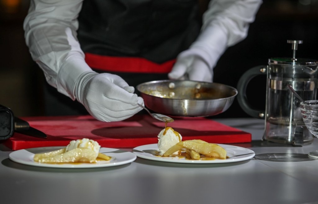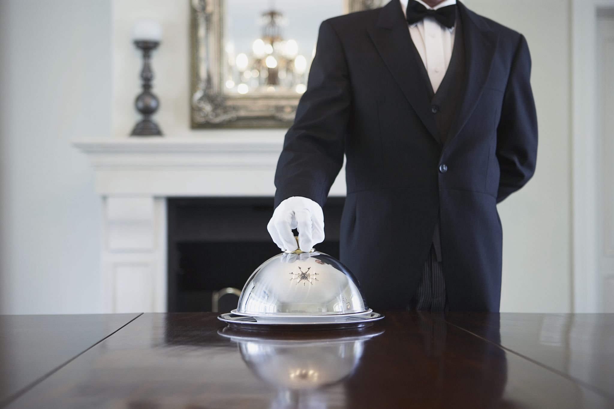 Las cenas tradicionales inglesas sugieren dos camareros. Uno de ellos pone comida en un plato caliente y el segundo la lleva a los invitados.