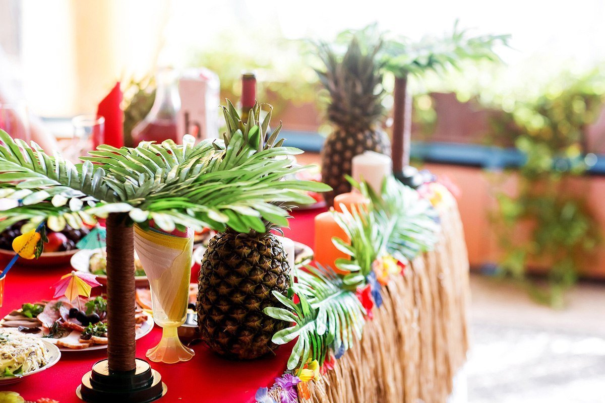 Una fiesta de estilo hawaiano asume frutas exóticas y colores vibrantes. En el mantel y las servilletas de color turquesa, puede poner el saludo hawaiano "ALOHA" y luego nadie dudará del tema de este evento.