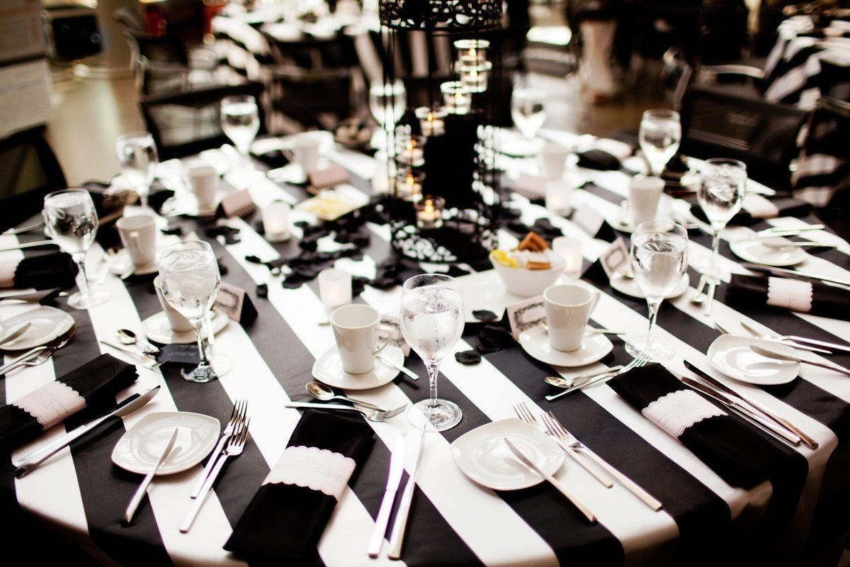 El estilo blanco y negro es exactamente lo opuesto al anterior. Para crearlo, solo se utilizan detalles en blanco y negro. El monocromo completo solo puede suavizar las plantas vivas. El tercer color debe activarse con mucho cuidado y dosificarse. Pueden ser rosas rojas de servilletas o frutas de lima, dispuestas a lo largo de la línea central de la mesa. En cualquier caso, lo principal es no exagerar y no privar a la porción en blanco y negro de su misterio, gráficos y encanto.