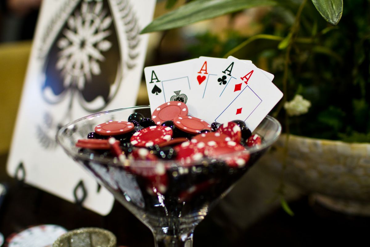 Configuración de tabla de estilo mafioso: posibles atributos de una tabla desprovista de mantel. Vasos para whisky, un cenicero con colillas de cigarrillos, una baraja de cartas, dados, papas fritas, cuchillos, pistolas, una pitillera, todo lo que está asociado con la mafiosa siniestra. Organice esas vacaciones para el aniversario de su esposo, y él lo recordará por mucho tiempo.