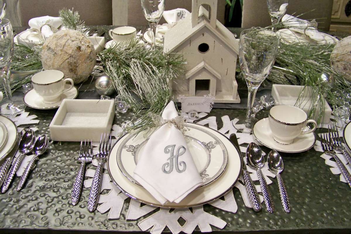 Da preferencia a los platos blancos con bordes convexos, como tallados por tus propias manos. Justo allí habrá cubiertos de plata antiguos y servilletas de abuela tejidas a ganchillo. El mantel debe estar hirviendo blanco o gris-blanco.