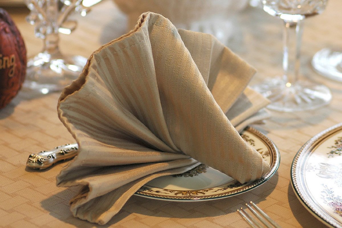 En los eventos oficiales, generalmente se coloca una servilleta a la izquierda del invitado. En un ambiente familiar relajado, se puede colocar en un plato. Idealmente, el mantel debe ser blanco como la nieve, sólido y planchado de alta calidad. También se permiten otros tejidos lisos de tonos neutros claros.