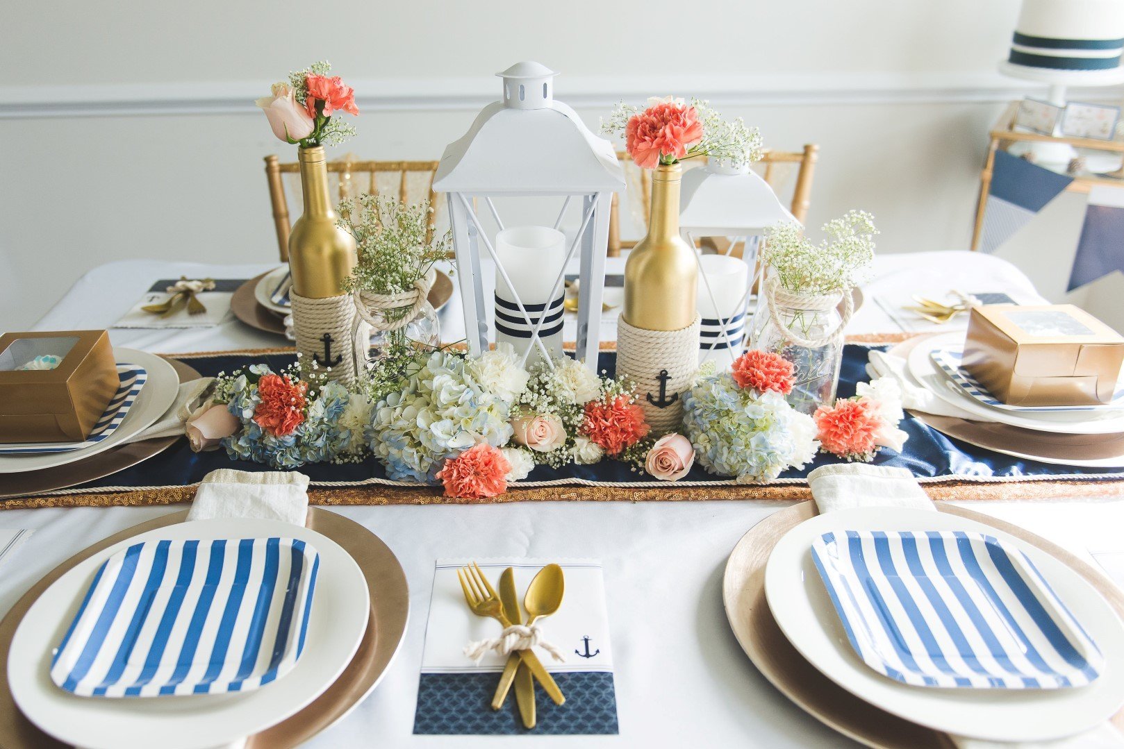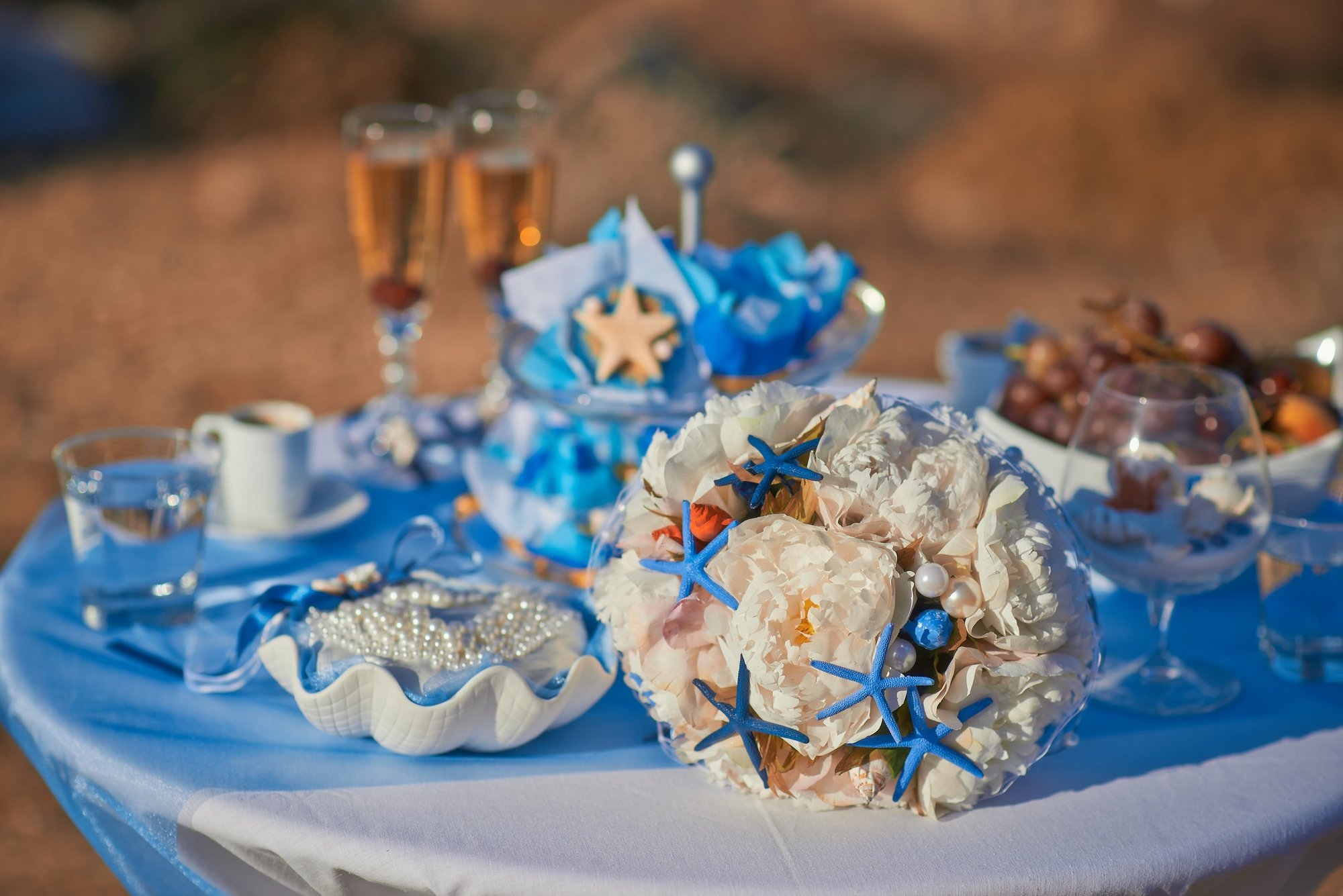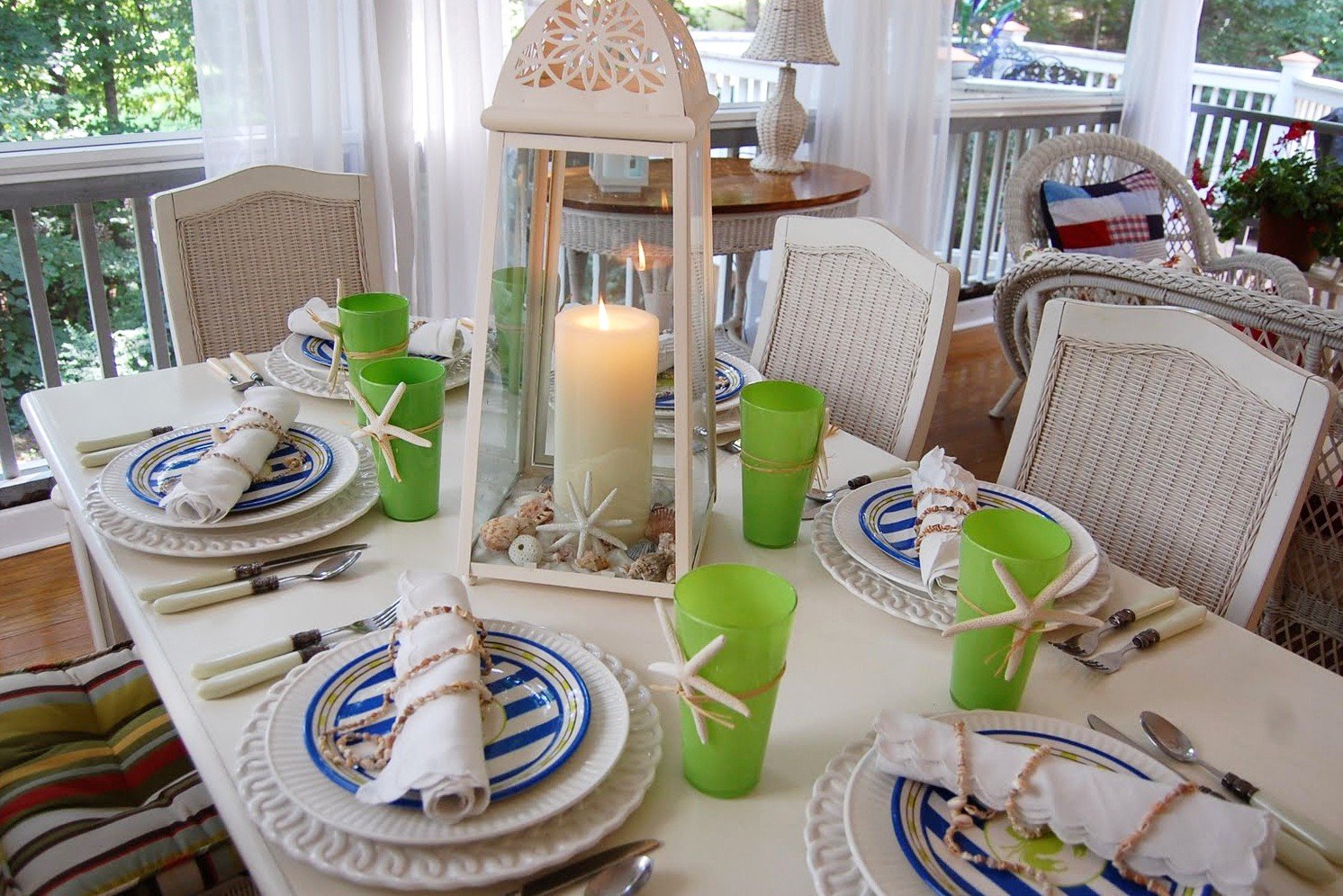Uno de los estilos de diseño temáticos más atractivos. La condición principal para un servicio marítimo adecuado es la elección de los colores blanco y azul y la presencia de patrones y accesorios marinos. Anclas bordadas en un mantel blanco como la nieve, servilletas o un mantel con rayas azules y blancas, platos con adornos de estrellas de mar y peces, cuerda de barco en accesorios indican que tiene una decoración en el tema marino. En el mantel puede colocar guijarros y conchas transparentes, cualquier pequeña cosa que enfatice la proximidad al mar.