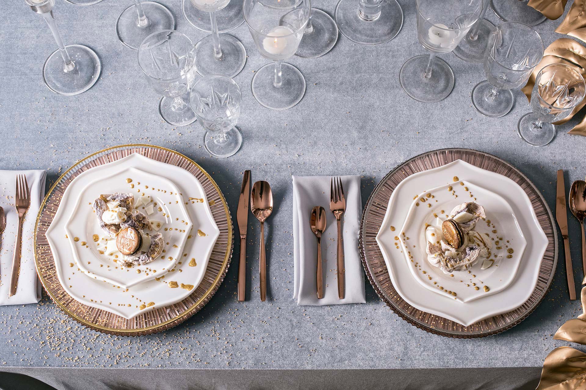 Las notas italianas se manifiestan en el lujo de servir la decoración. Aquí reina los adornos dorados y plateados, accesorios vintage. El oro y la plata aparecen en los bordes de los platos, en los cubiertos, servilleteros y salsas. Las gafas de cristal, doradas y plateadas encajarán perfectamente en la mesa italiana.