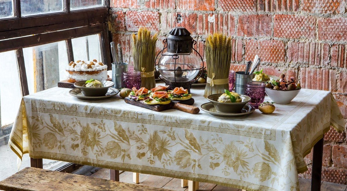 Un mantel es la base de una mesa festiva. Los revestimientos de hule y hule, así como los utensilios de plástico, no tienen lugar en una recepción. No es la mejor opción: productos de telas sintéticas finas. Se deslizan sobre la mesa, se arrugan y parecen bastante baratos. El textil natural es una cuestión completamente diferente.Los manteles sólidos hechos de fibra de lino o algodón denso con tejido de satén le dan al evento un estatus especial y comodidad. Cubrir la mesa es mejor hacer dos capas: debajo de los textiles principales hay una tela adicional en tono.