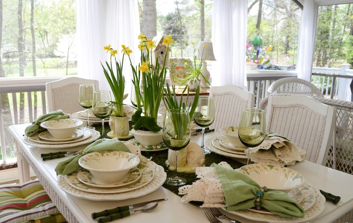 La popularidad del uso de motivos naturales para servir aumenta año tras año. Las características principales de este estilo son los tonos naturales y tranquilos, el uso de madera natural y telas. Bienvenido: muebles de mimbre de mimbre, plantas verdes y una gran cantidad de luz cálida. Cubrir la mesa con un mantel o no es solo tu elección. Si aún decide usar un mantel, dé preferencia a los materiales naturales. Como el metal de estilo ecológico es persona non grata, elija cerámica, madera o cristalería. Es preferible utilizar cerámica mate, ya que el brillo en este caso es inapropiado. Los platos con bordes irregulares, como si los bordes rotos se vean originales.