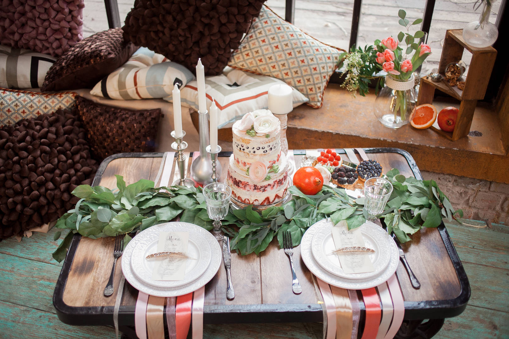 Es necesario que el tono de acento se repita en diferentes accesorios: servilletas, guirnaldas de flores, cintas para decorar cubiertos, tarjetas con lugares para invitados, globos colgados debajo del techo. Esto ayudará a combinar elementos dispares en un solo todo y obtener una imagen armoniosa. No pierdas de vista esto. Después de todo, ¿quieres fotos hermosas?