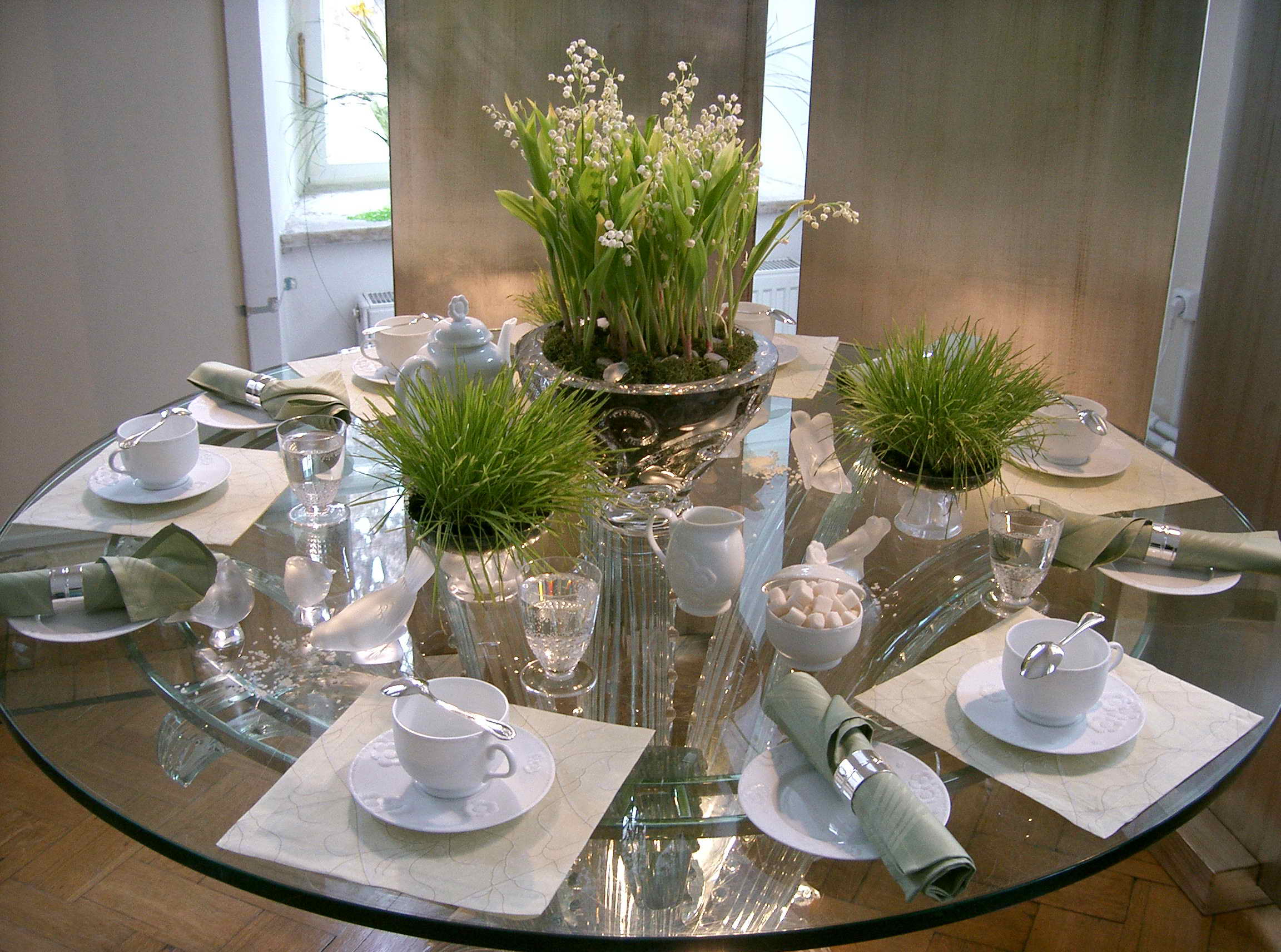 Los floreros se seleccionan mejor bajo.No protegerán a los invitados unos de otros e interferirán con la conversación. Una alternativa puede ser una maceta en una pata larga, delgada y preferiblemente transparente. Las flores en este caso se encuentran por encima del nivel de los ojos y no cierran la revisión, y una pierna delgada es casi invisible.