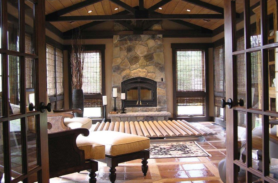 Las chimeneas de madera, como muchas otras, están hechas con una caja de fuego cerrada o abierta. Es mejor colocar un hogar así incluso en la etapa de construcción de una casa: es importante hacer una chimenea correctamente para que la madera no se queme demasiado rápido, el humo no entre en la habitación. En la puerta de vidrio cerrada se realiza utilizando una tecnología especial que evita la aparición de hollín. En sí mismo está hecho de ladrillo, hierro fundido, revestido con piedra o madera.