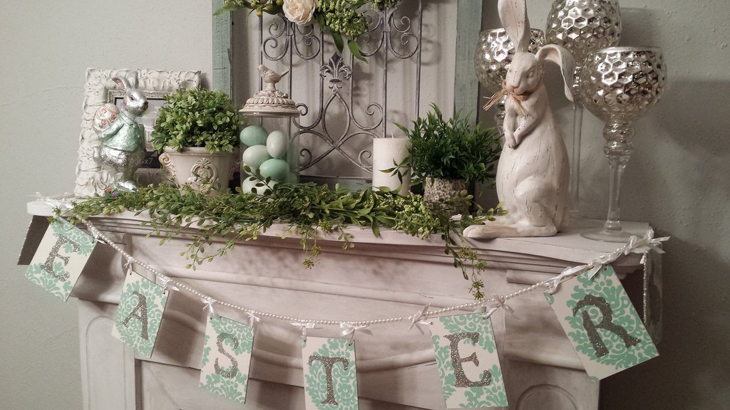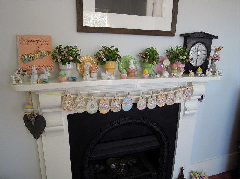 Un atributo indispensable de esta celebración es el huevo. Pollo pintado o huevos de espuma hechos en casa en cestas de mimbre de periódicos o periódicos se colocan en la repisa de la chimenea, hay pasteles de Pascua, conejos de Pascua, ángeles de porcelana y verduras de primavera en jarrones. Guirnaldas de papel y tela con huevos, decoraciones de cartón de colores, bolas textiles, elementos bordados completan el interior.