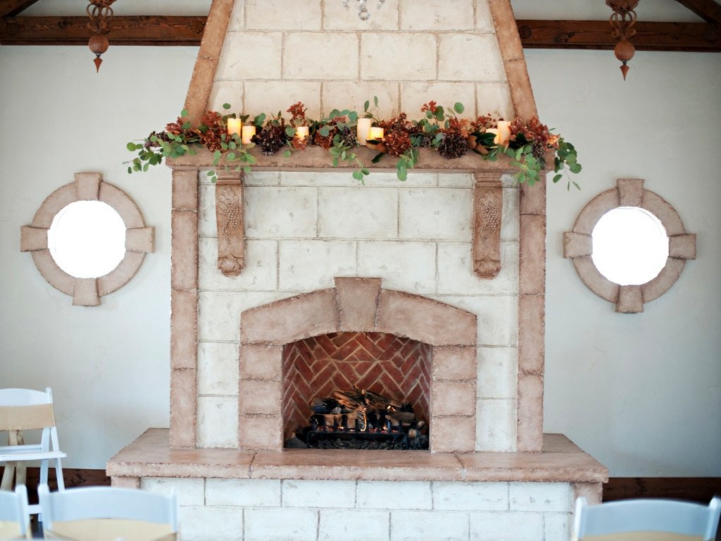 Velas blancas en candelabros, palomas de porcelana, corazones de papel y flores harán que las vacaciones sean lujosas. La chimenea en sí simboliza el hogar, una buena idea sería convertirla en el centro del interior de la boda. A menudo se usan ramos de rosas blancas, artesanías de poliestireno, guirnaldas de papel, fotos de recién casados, paneles con sus nombres, cintas de colores pastel con deseos de felicidad escritos en ellas.
