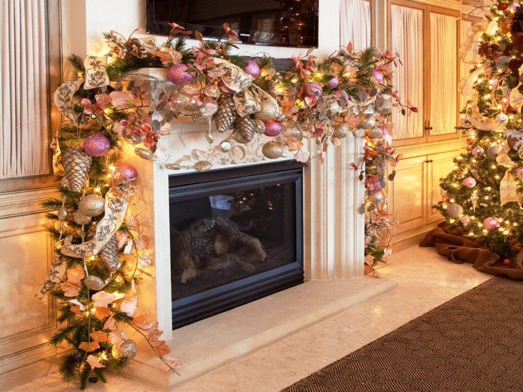 Decoraciones de abeto, ramas de pino serán útiles para las vacaciones de Año Nuevo. Están decoradas con juguetes navideños, conos pintados, espuma de nieve, pintura en aerosol dorada. Se colocan guirnaldas y guirnaldas de LED alrededor del perímetro, se colocan cestas en los estantes, se colocan mandarinas y dulces, se cuelgan calcetines decorativos sobre el hogar, en el que Santa Claus debe poner regalos. Se colocan cajas de cartón brillante en un estante o una al lado de la otra, estrellas de papel, copos de nieve y ángeles de Navidad completan la imagen.