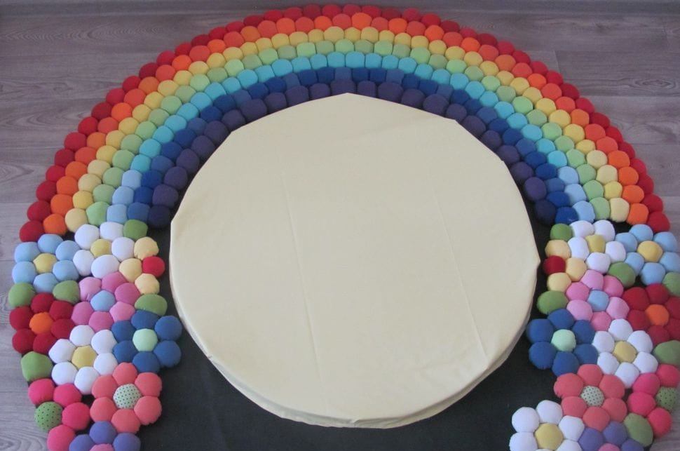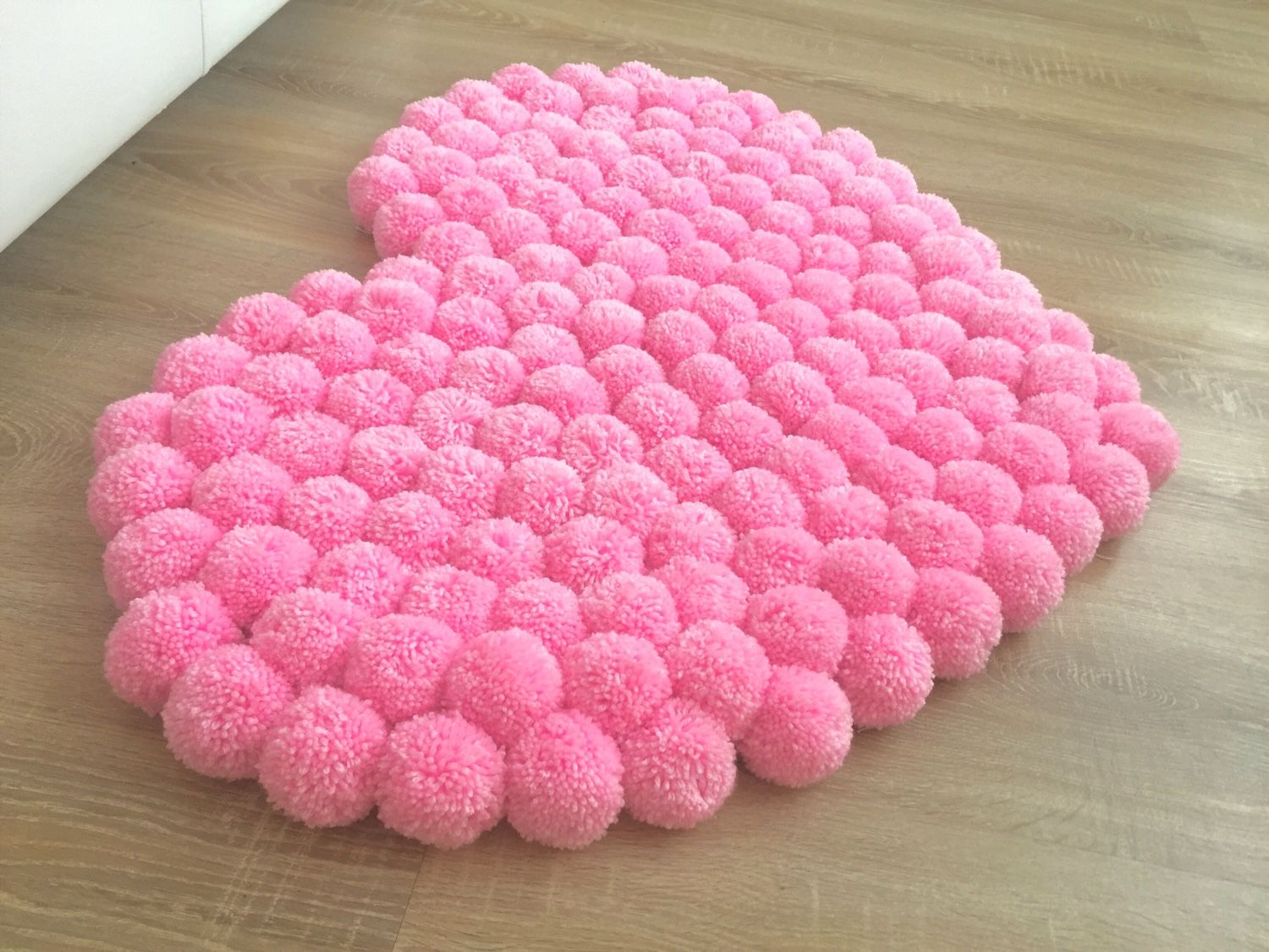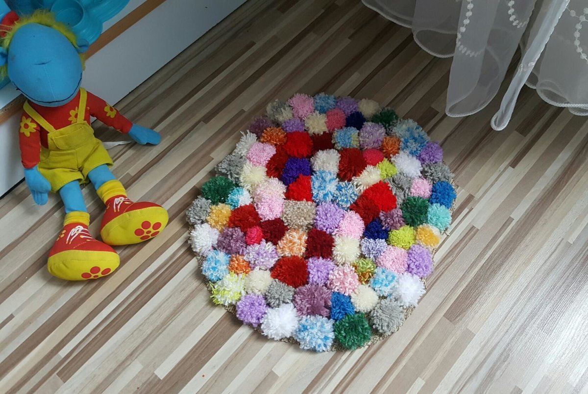 A continuación, los pompones, que tomarán varios cientos, se cosen a la malla, el lienzo textil. Después de terminar el trabajo, el interior con los nódulos se cubre con un paño.Para que el producto se vea texturizado, los pompones están hechos de diferentes tamaños, pero lo más exuberantes posible. La forma de una alfombra de este tipo se hace casi cualquiera: la imitación de pompón de la piel de un oso, leopardo y cebra se ve muy original.