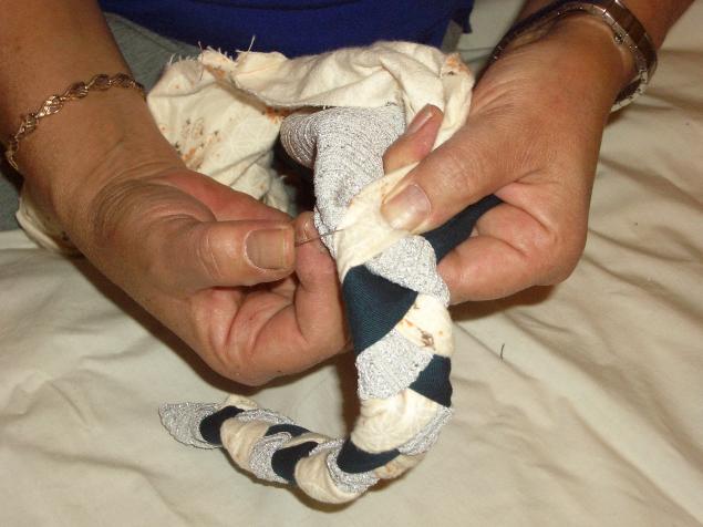 Una alfombra de toallas de felpa cortadas en cintas sale suave, agradable al tacto: a menudo se coloca en el baño, la guardería y se decora un interior romántico. Para la fabricación necesita dos o cuatro toallas, albornoces, tijeras, hilos, agujas, alfileres. En el curso del trabajo, las toallas se cortan en tiras, de 5-7 cm de ancho, de modo que las tiras son largas, se aumentan gradualmente cosiendo entre sí. En total, se requiere hacer tres cintas a partir de las cuales se teje una trenza larga, que se retuerce en espiral desde el centro, sujeta con puntos discretos.