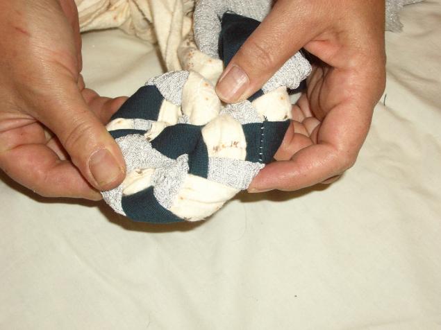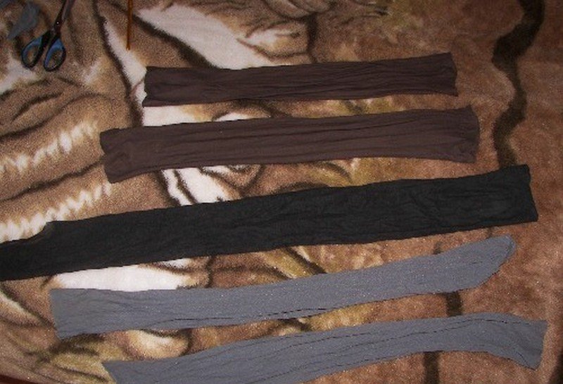 Un producto interesante de arpillera, otro tejido denso, decorado con trenzas, trenzas, flores de medias de colores cosidas juntas. Tal alfombra de medusa puede no tener una base, ajustada, sujeta con bucles asimétricos. Otra de las medias se puede tejer fácilmente, en agujas de tejer, bobinas.
