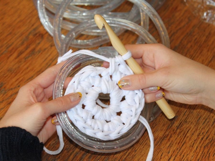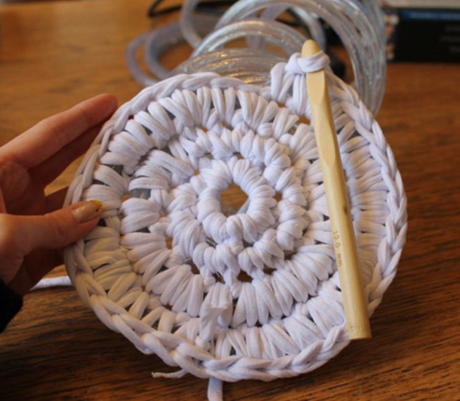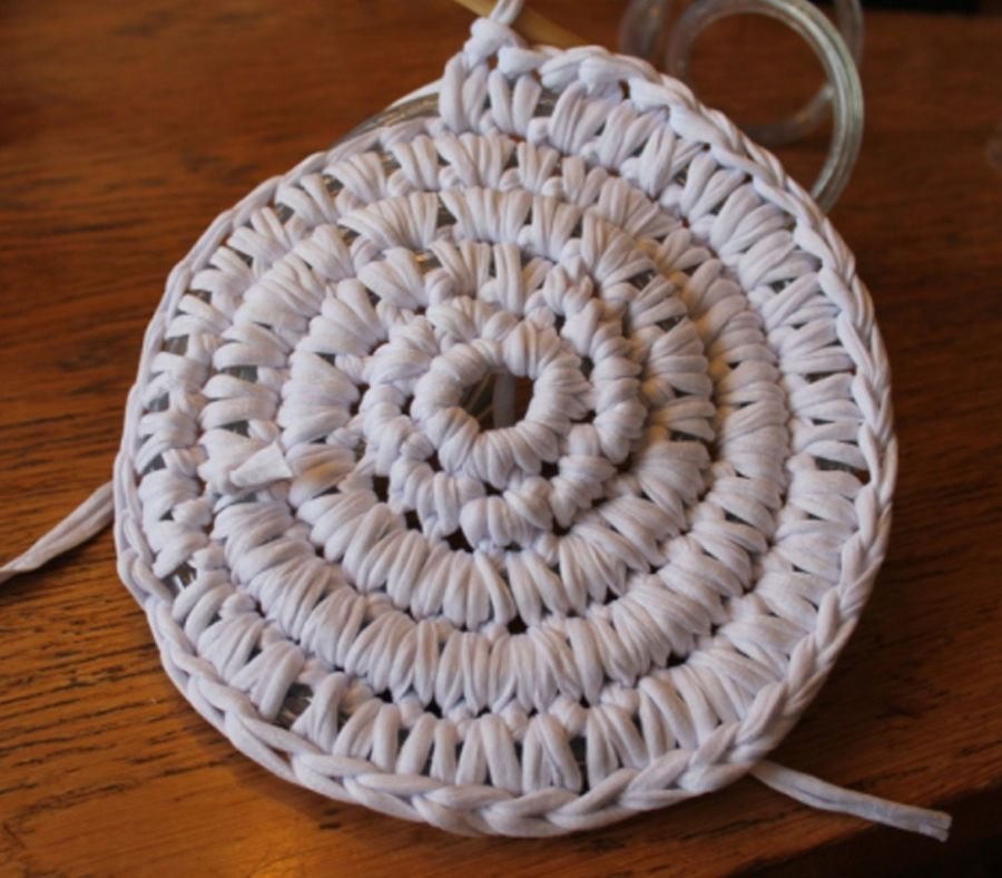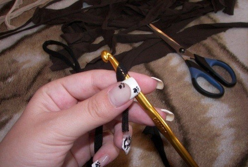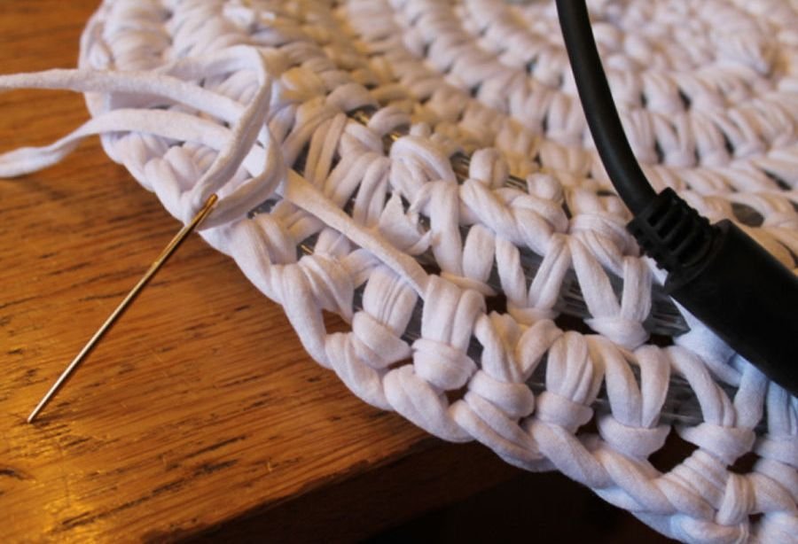 Primero, debes clasificar las prendas de punto viejas de colores: camisetas estiradas, mallas ajustadas, pantalones de chándal y más. Se tiran cintas estrechas sobre la base, cruzadas en cruz en el medio, desde donde se hace el tejido. Teje con una cinta larga, gástala desde la parte inferior, luego desde la parte superior de la urdimbre, que también puede estar hecha de cuerda, hilo, cordón de lino. Al final del trabajo, los hilos de urdimbre se cortan, se anudan.