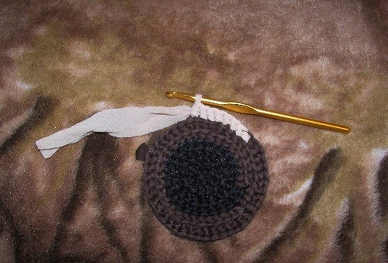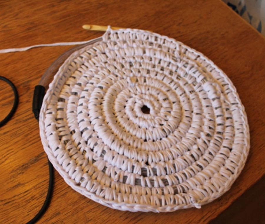 La coleta está tejida con un cordón, hilo de polímero, cinta tejida, cortada en tiras de bolsas de plástico. La última opción es óptima para la cocina, el taller, decorar el estilo interior pobre de la creencia en el arte. Para el trabajo, se trenza una trenza de tres o cuatro cintas, cada una de las cuales se incrementa de vez en cuando, la fila anterior con la siguiente se sujeta con hilos. Este artículo es redondo u ovalado. Para crear un cuadrado, un rectángulo, la coleta se coloca en filas rectas de borde a borde.