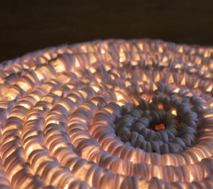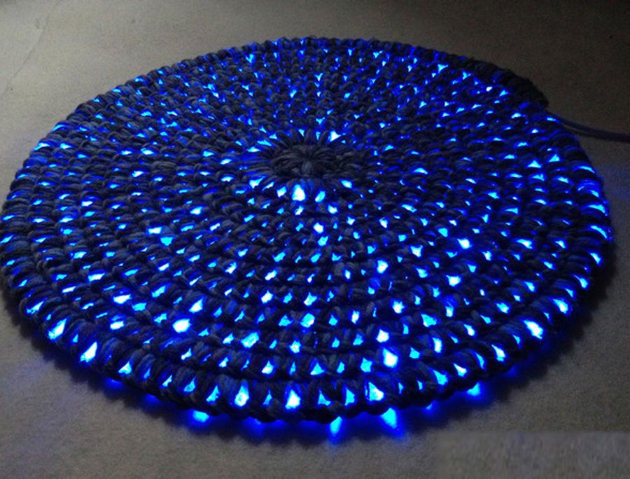 La luminosa lámpara de noche de alfombra: la artesanía más impresionante para la casa. Está hecho de hilo grueso o hilo, que está atado a una tira de LED retorcida en espiral. El trabajo se realiza con un gancho grueso, relativamente delgado, preferiblemente hilos ligeros. La larga "cola" de una alfombra de este tipo puede ir más allá, colocarse a lo largo del perímetro de la habitación o formar un patrón en la pared.
