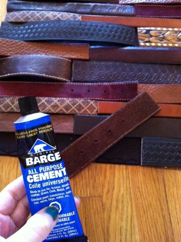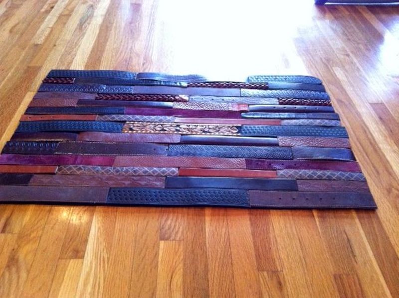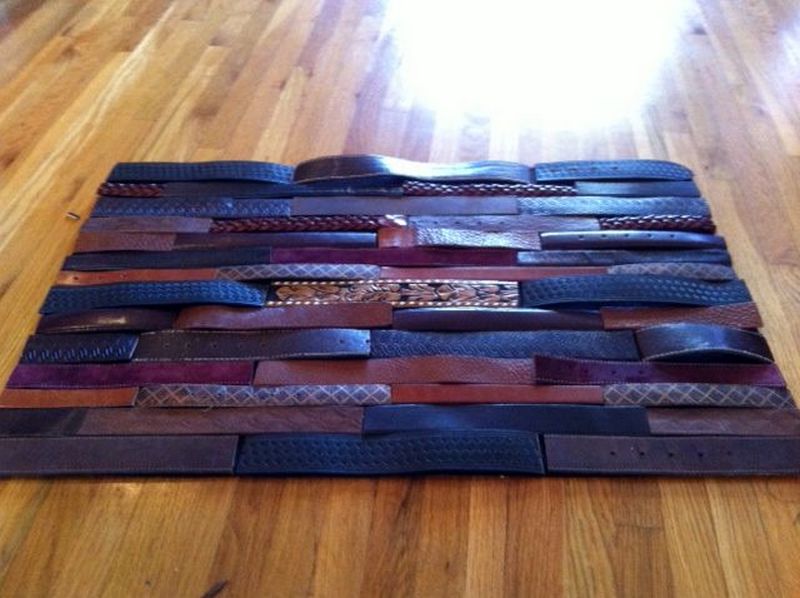Los cinturones también se pueden pegar a la base de la tela, goma, cortar en cuadrados, tejerlos, sujetarlos solo alrededor del perímetro. Si los detalles están pegados a los cuadrados de madera contrachapada, tableros de fibra, aparecerá una apariencia original de "pisos de cuero".