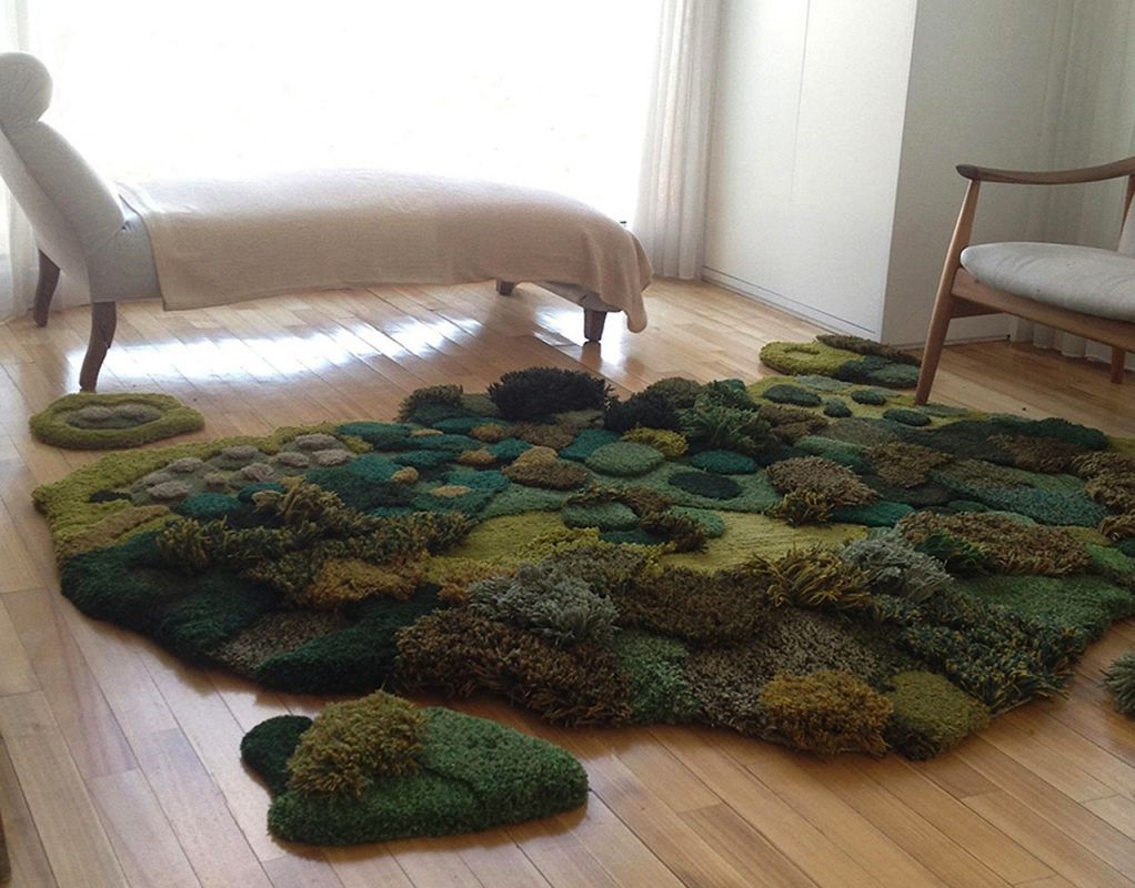 Esta alfombra es adecuada para áreas al aire libre en el jardín, habitaciones excesivamente húmedas. Esta es una forma única de crear en casa un pequeño rincón de la naturaleza: el más ecológico, agradable en términos de sensaciones táctiles. La base comprada consiste en látex, tiene muchas células, cada una de las cuales contiene un trozo de musgo vivo, que debe rociarse periódicamente con agua.