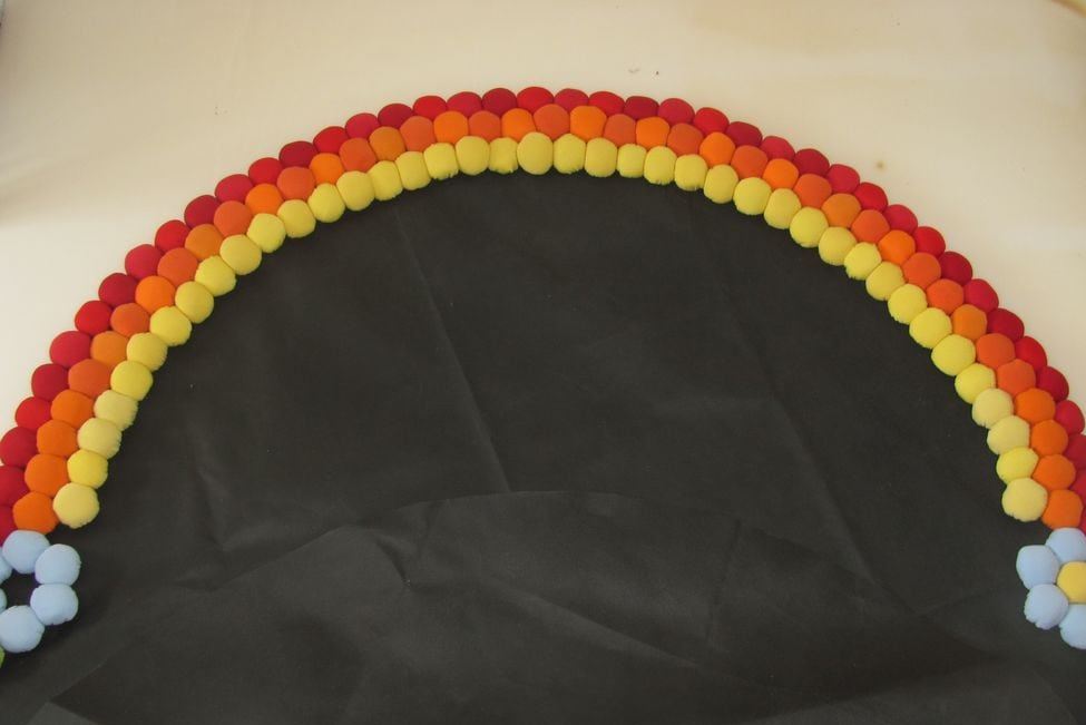 Para un felpudo esponjoso de pompones, necesita una malla de construcción de un tamaño adecuado o un pedazo de arpillera. Este artículo no es muy práctico, pero increíblemente hermoso. Es ideal para un dormitorio acogedor, una guardería, una sala de estar. Primero, necesita hacer muchos pompones de colores: para esto, se cortan dos "rosquillas" idénticas de cartón, luego se pliegan juntas, se envuelven con hilos, que luego se cortan a lo largo del borde exterior, atando en el medio.