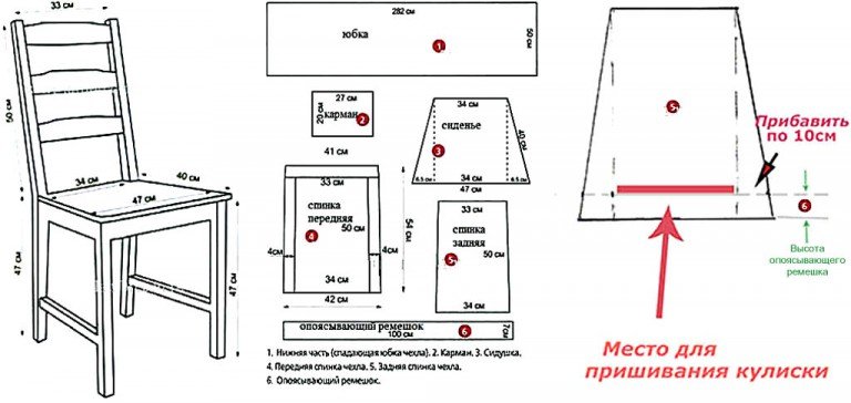 El papel se aplica al asiento de la silla, se sujeta con agujas de sastre y se rodea los bordes. Haga un margen de aproximadamente un centímetro y medio para el stock. A continuación, la parte se corta. El patrón de la parte posterior se realiza de la misma manera. Luego se dibuja un rectángulo en la hoja, que corresponde a la longitud de las piernas y el ancho del asiento en la parte delantera de la "falda", y se le agregan 10 cm del patrón lateral, 5 cm en la parte inferior y 1.5 cm de margen para la costura superior. Del mismo modo, dibujar lados. Se agregan 15 cm al borde cerca del exterior de la parte posterior y se aplica una hoja larga y ancha al exterior.En el dibujo de las patas traseras de la silla, se agregan 5 cm a continuación y 1.5 cm para la asignación. Los patrones se suavizan porque cualquier bulto interferirá con la costura. Además, el dibujo se transfiere al material, teniendo en cuenta la posición del hilo compartido. Puedes dibujar en la tela con un lápiz, un trozo de jabón o tiza. El patrón está hecho en dos muestras.