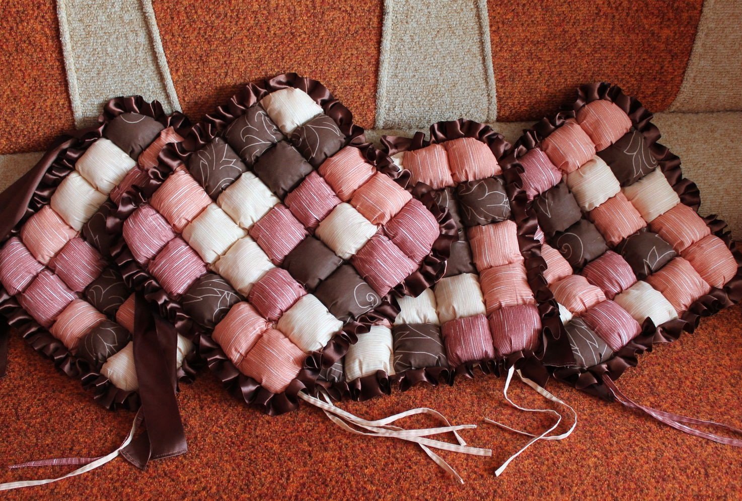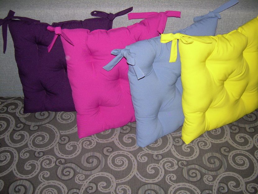 Primero, se prepara un patrón. Necesitas un lápiz y un periódico. Luego, estas medidas se transfieren al material doblado por la mitad. Para cada una de las patas, se requieren dos ataduras de aproximadamente 10 cm de largo y se corta un acondicionador de invierno sintético de acuerdo con un dibujo similar. Los parámetros de ancho y largo se reducen en 1 cm. Los cordones deben doblarse dos veces de ancho, con el interior hacia afuera; Después de eso, cose y gira hacia el frente. Con varias puntadas grandes, debe unir el acondicionador de invierno sintético al interior y los lazos a las esquinas. Ahora se garabatea toda la caja del asiento, excepto un espacio de 20 cm de longitud.A través de él, la cubierta se girará en la parte frontal. Los bordes de los detalles se cosen junto con una costura secreta. Además, el asiento está planchado. Si lo desea, al final debe comenzar el diseño final con cintas y varios elementos decorativos. Todo esto no llevará más de unas pocas horas, y si hay experiencia en costura, media hora o una hora.