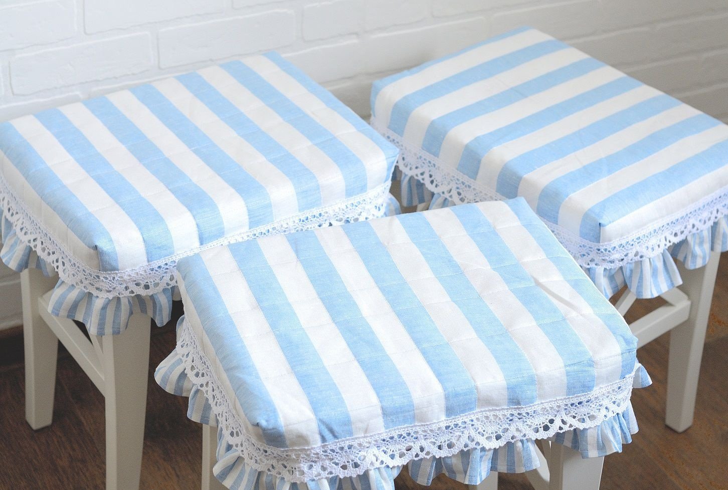 El principio de fabricación es similar al método de coser una capa para un asiento cuadrado. La opción más simple implica el uso de chicle. En primer lugar, se toman medidas de las heces, se determina el diámetro. La tela está marcada con un margen de unos 5 cm. El reverso de la tela está doblado por 2 cm. Debe coser un dobladillo a 1 cm de la curva, como resultado, saldrá un "túnel". La goma se ubicará en ella. La siguiente etapa se está llenando. Se hacen pequeños cortes en el espacio en blanco. La almohadilla se distribuye uniformemente por todo el asiento. Los cortes se cosen cuidadosamente, esto se hace solo manualmente. Luego, el producto se garabatea alrededor del perímetro en una máquina de escribir. Algunos modelos de envolturas son visualmente similares a las tapas de las latas. Además, las fundas tejidas se verán bien en un taburete redondo. En el proceso de creación, debe usar varios bucles: