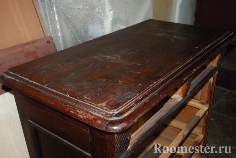 La decoración del tocador de bricolaje comienza con una espátula de construcción. Retire la capa rezagada del árbol sin dañar la superficie. Recuerde quitar toda la pintura.