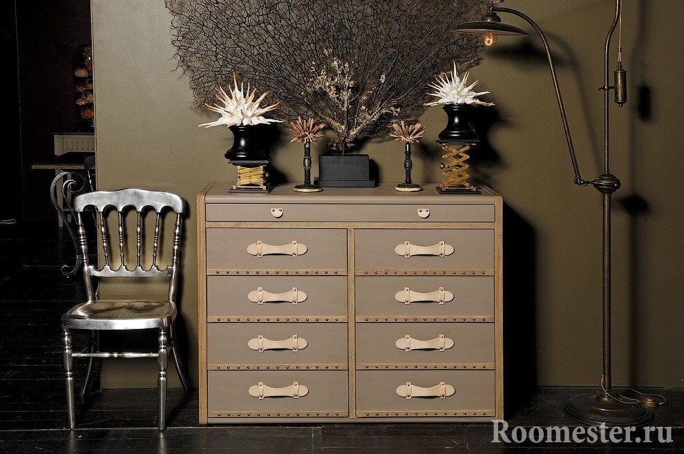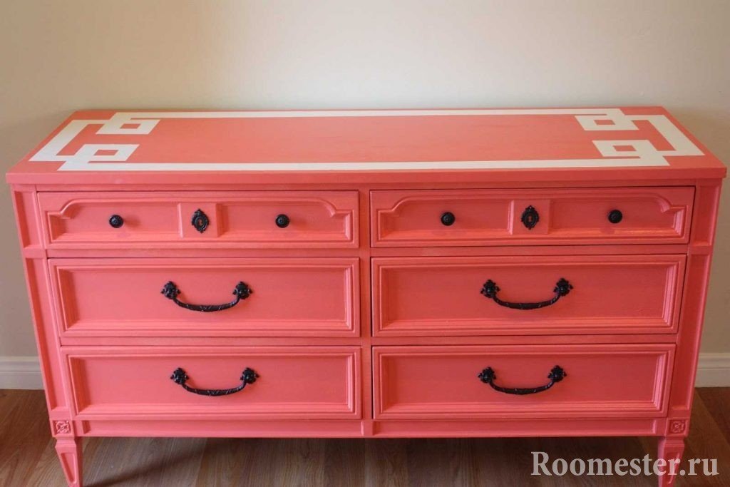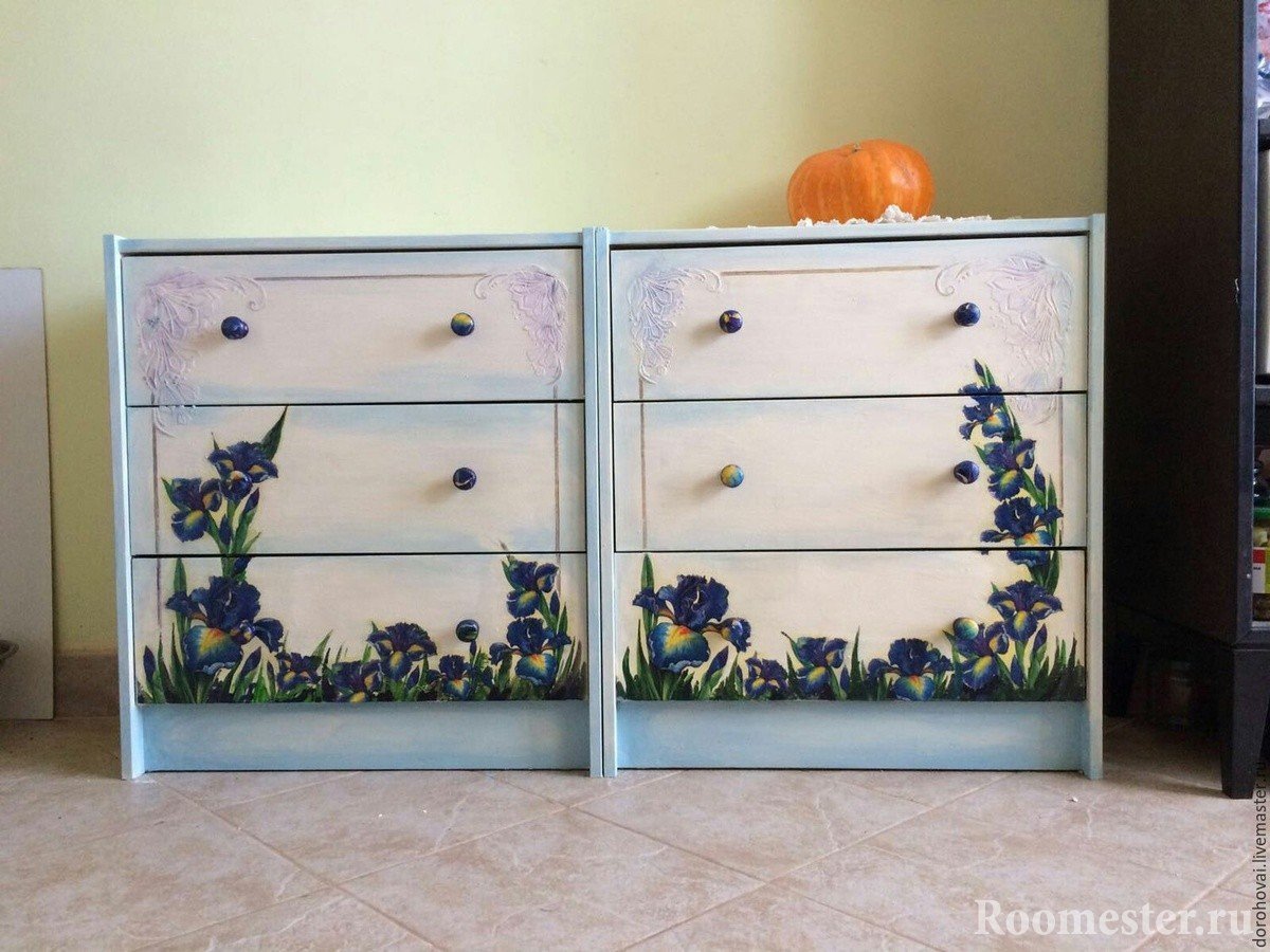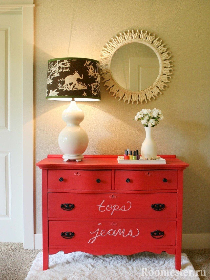 Si se trata de un diseño artístico, es adecuada la pintura acrílica del color correcto. Para aquellos que desean modernizar la vieja cómoda, una buena opción es reemplazar los accesorios de los muebles: puede agregar nuevas manijas o paneles de espejo.