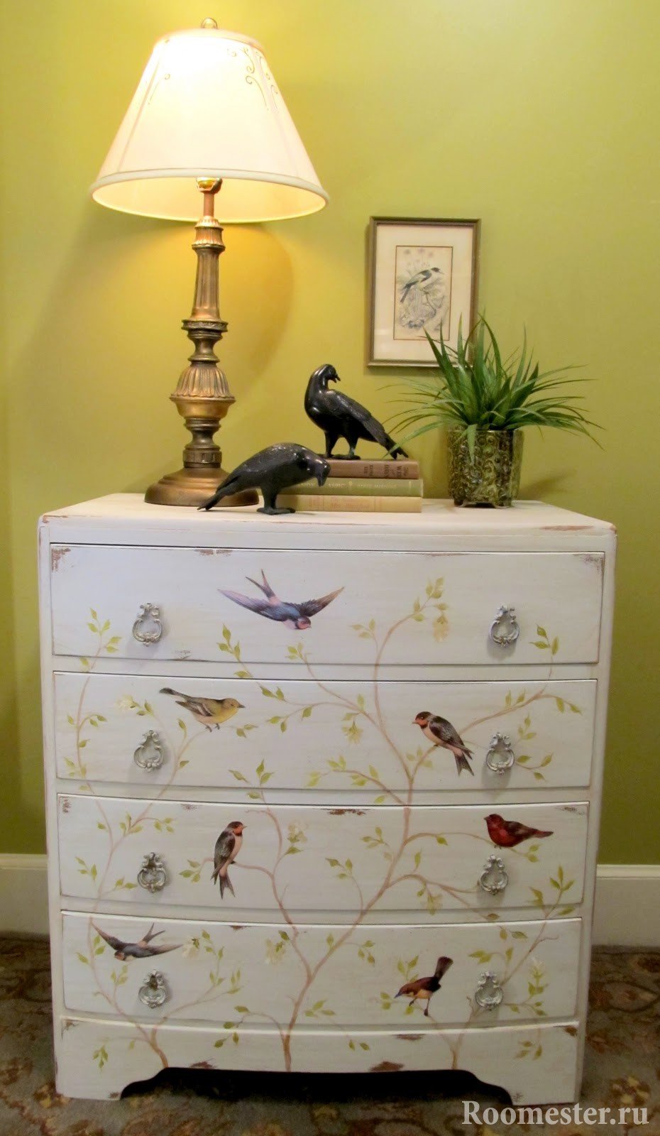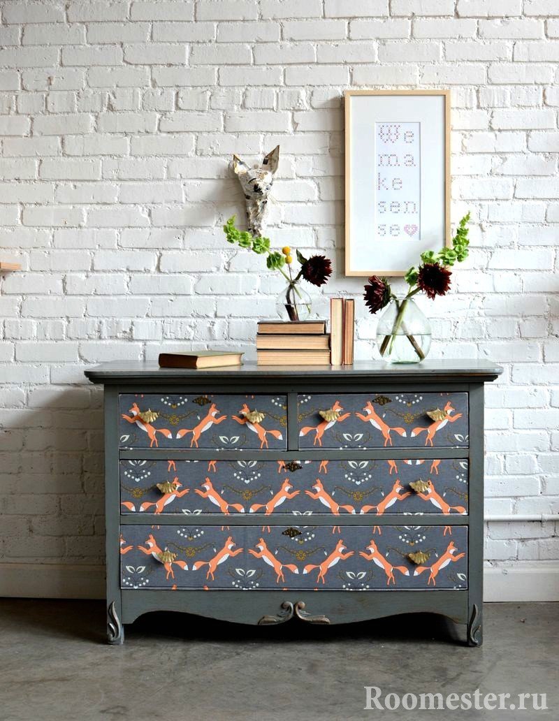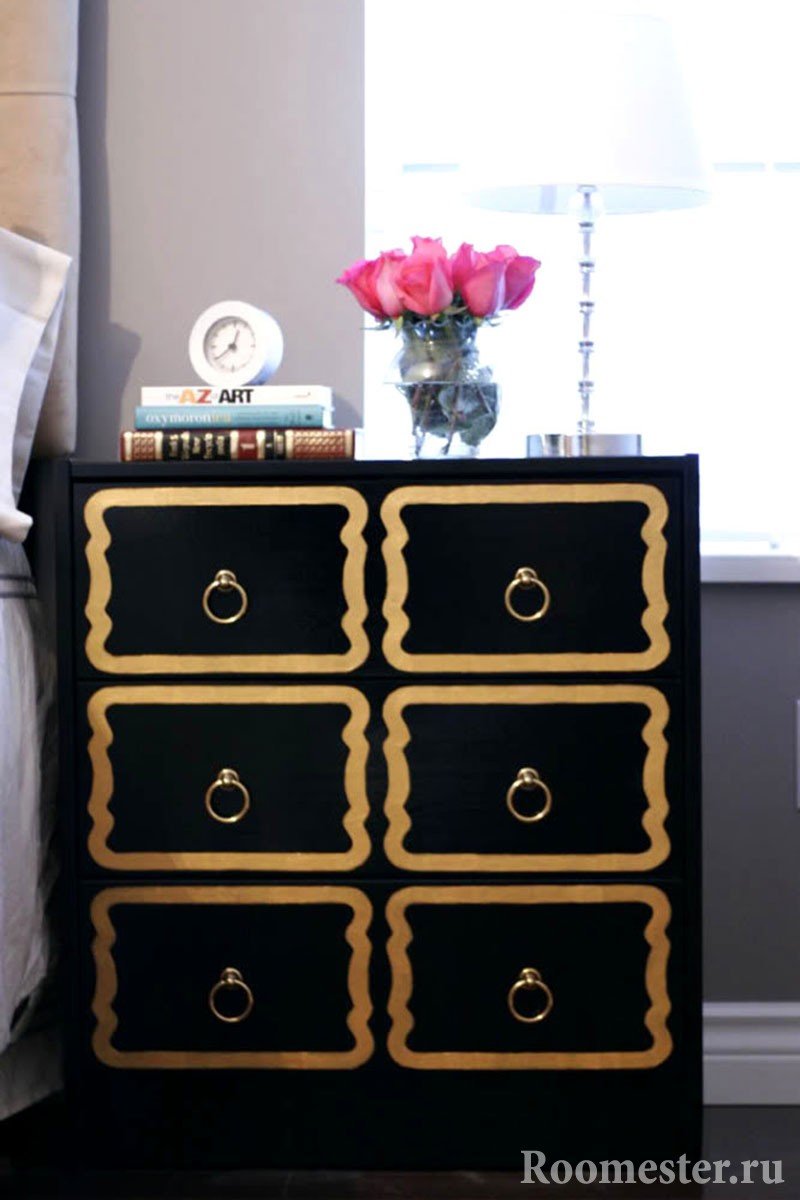 Si se trata de un diseño artístico, es adecuada la pintura acrílica del color correcto. Para aquellos que desean modernizar la vieja cómoda, una buena opción es reemplazar los accesorios de los muebles: puede agregar nuevas manijas o paneles de espejo.