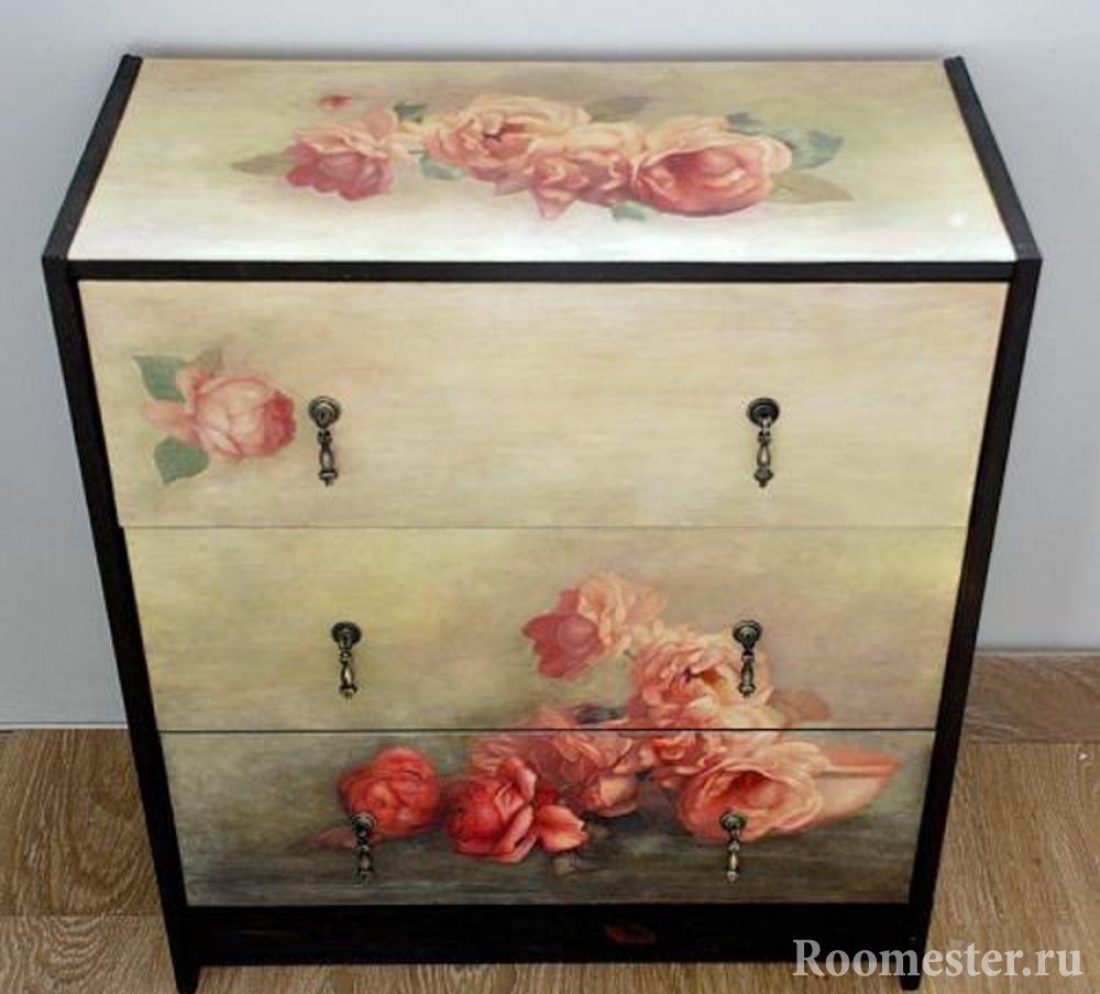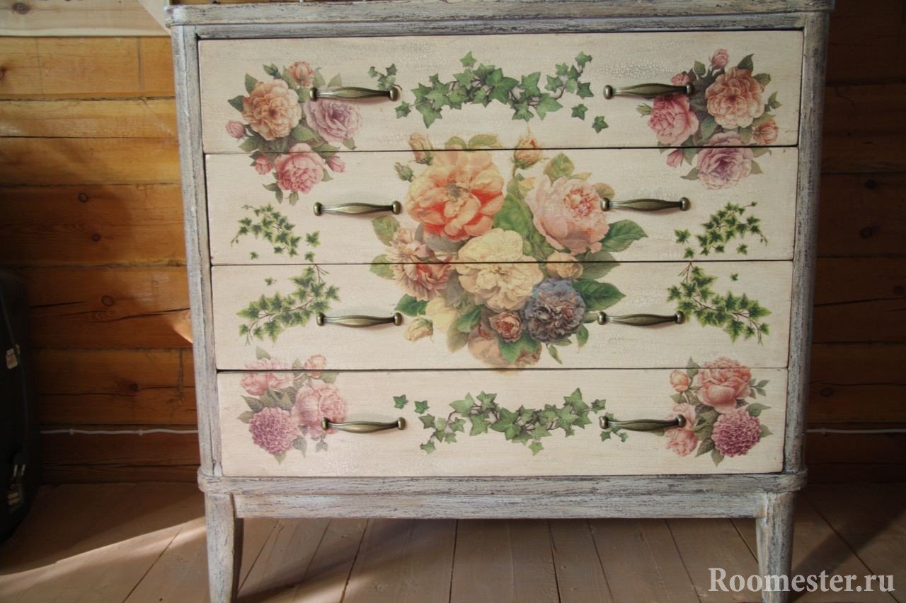 Aplique pegamento de PVA a todas las partes para pegarlas en la cómoda. Lubrique la parte frontal de las imágenes con el mismo pegamento, lo que las protegerá de las influencias externas. Si se trata de flores o patrones adornados, se pueden extender con dibujos de líneas y rizos que sobresalen de la superficie de la mesita de noche.