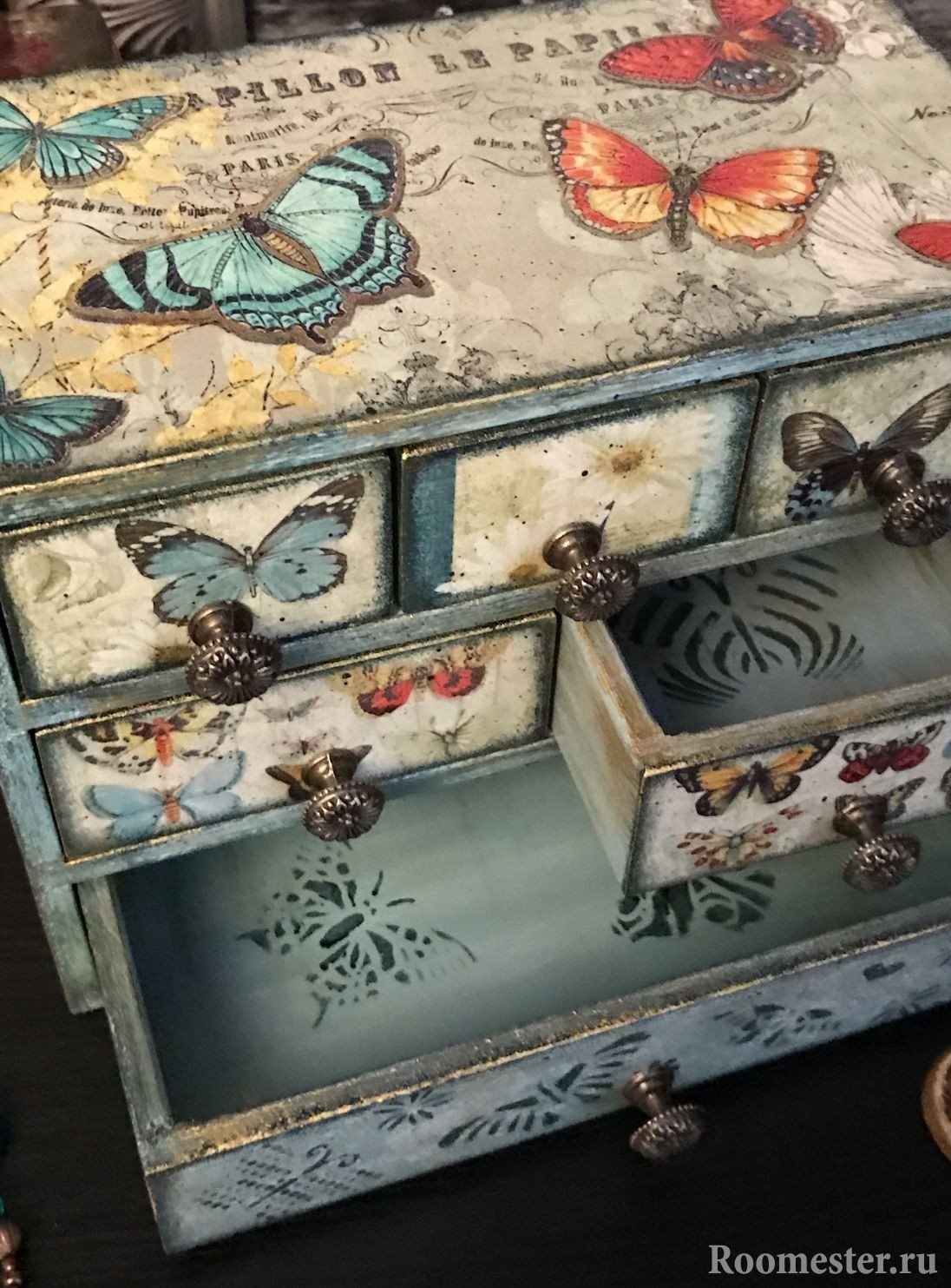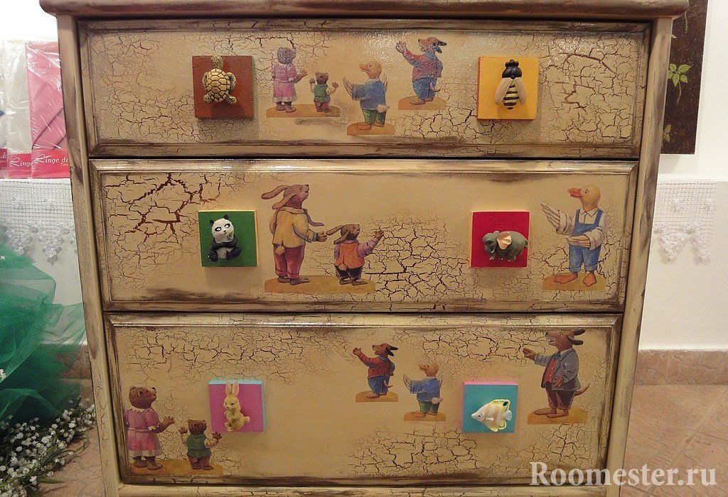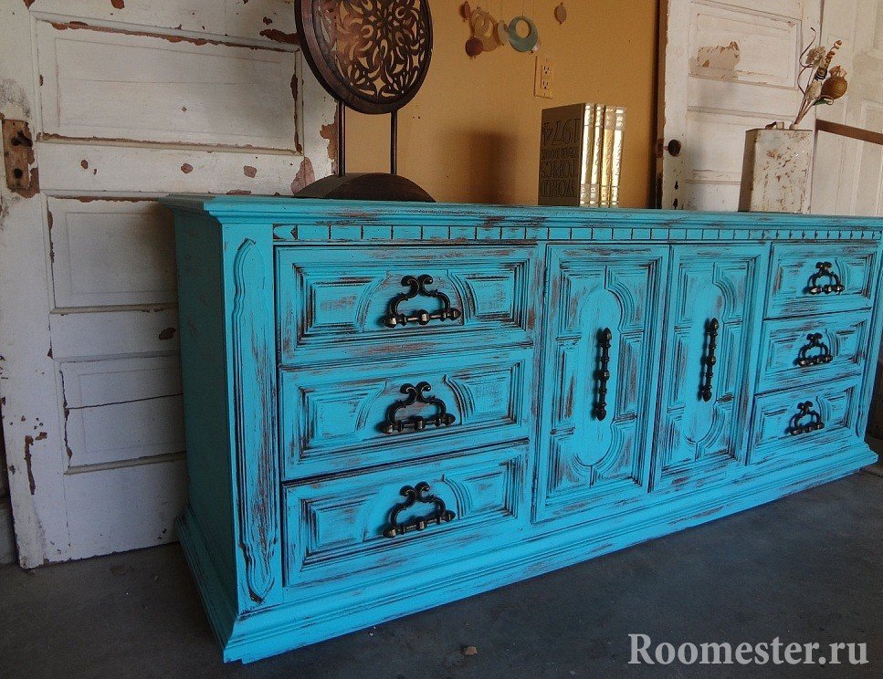 Retire los accesorios, cajones y encimeras de la cómoda. Lije toda la superficie y limpie con una esponja húmeda. Aplique la primera capa de pintura y deje secar. Los siguientes desgastes serán intencionales y se realizan con papel de lija y una vela. Después de eso, aplique una pintura de un tono diferente (para su gusto) y limpie con una esponja las áreas que estaban cubiertas con cera: en estos lugares, la pintura se borrará. La etapa final es una técnica de decoupage o pintura del autor. Además, todo está cubierto de craquelado.