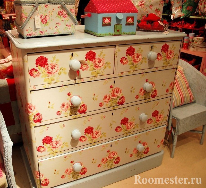 ¿Cómo decorar una cómoda con la técnica de decoupage? Esta es una extensión real para la imaginación.Decoupage implica decorar muebles con la ayuda de tarjetas especiales y servilletas de tres capas. También debe obtener pintura acrílica blanca, pegamento PVA, tijeras, un rodillo y una esponja. El proceso comienza con un rodillo de pintura en toda la superficie de la cómoda. Luego, comience a cortar las imágenes deseadas. Para darle un aspecto antiguo después del secado completo, revise el producto con papel de lija. Esto debe hacerse con cuidado, a lo largo de las líneas de madera.