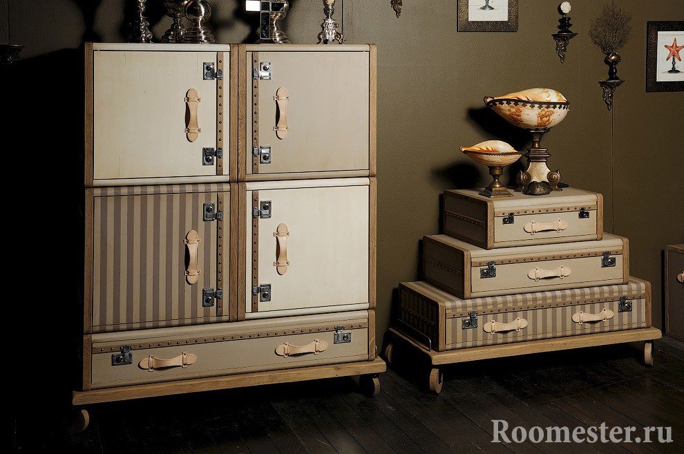 Los accesorios se retiran de la cómoda y se limpia el producto. Después de eso, la superficie se cubre con una capa irregular de masilla: cuanto más descuidada, mejor. Cubra la cómoda con pintura blanca y marque las áreas que se van a manchar con cinta adhesiva. Disuelve los colores escarlata y azul. Las manchas que pueden aparecer durante el proceso de tinción son solo una ventaja. La mesa y los lados se procesan con papel de lija. El trabajo terminado está cubierto con toplazury (use una esponja para esto). El tono ideal de toplazuri es "nuez". Después de conducir en muebles decorativos, clavos e instale los accesorios oscurecidos con pintura marrón aceite.